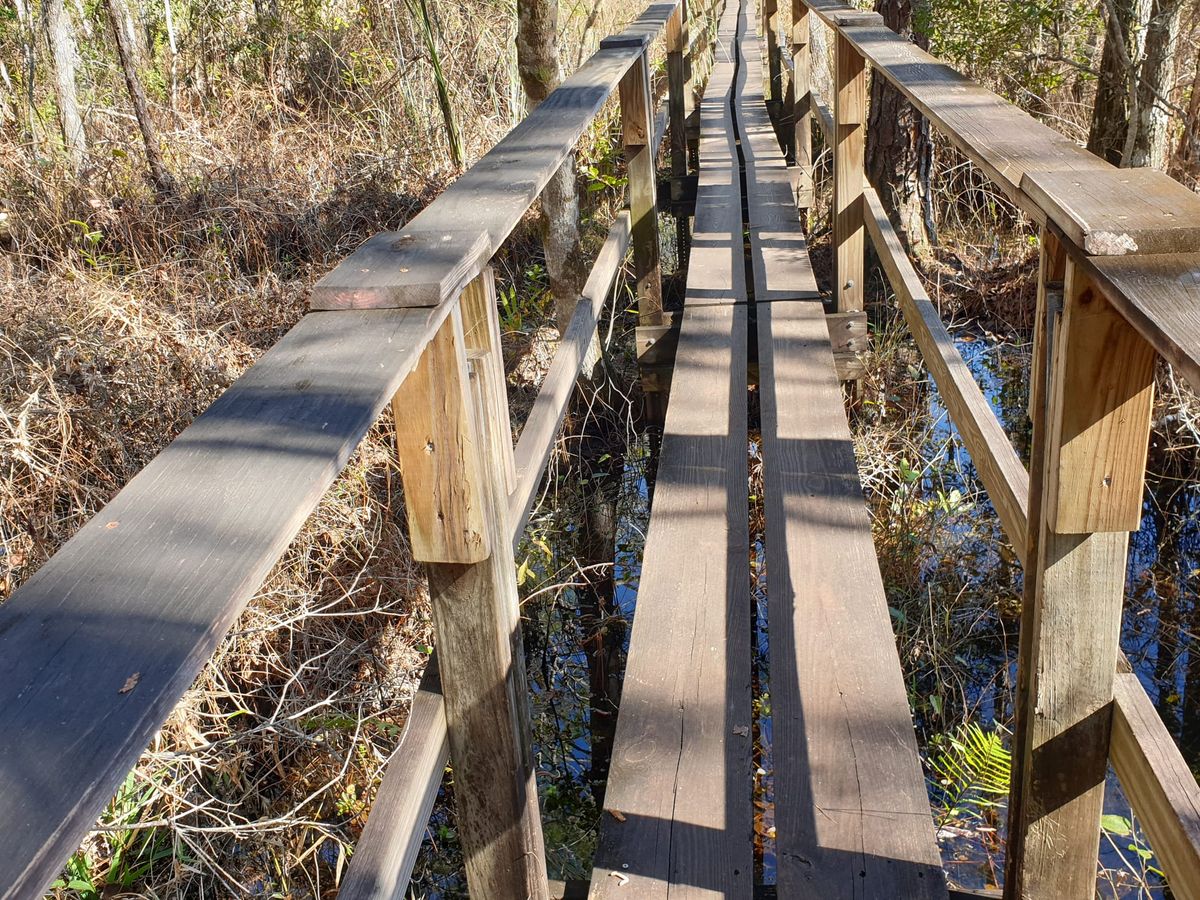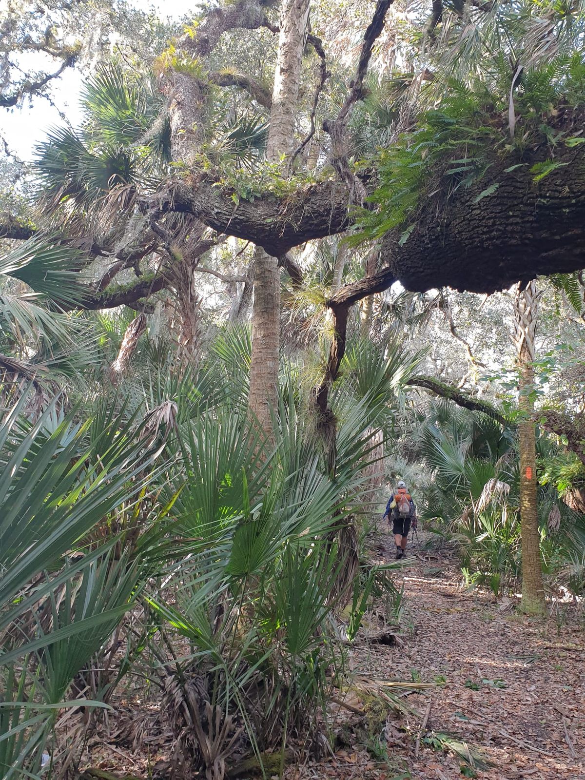 Es wird gar nicht richtig dunkel während der Nacht. Wir befinden uns in der Nähe von Orlando, der Lichtschein der großen Stadt erleuchtet den Himmel. Kein weiterer Regen, so dass die Klamotten morgens nur noch etwas feucht sind und damit auch wieder leichter. Besonders schöner Tag ! Vielleicht liegt es daran, dass es gestern von früh bis spät nur kalt und mühsam war. Heute geht es uns richtig gut, wir marschieren voll motiviert los. Schon bald nach dem Start treffen wir einen „Volunteer“, einen freiwilligen Helfer, der sich um diesen Abschnitt des Trails kümmert. Der Mann läuft ganz früh am Morgen seinen Bezirk ab, um zu gucken, wie der Zustand des Weges nach Sturm und Regen ist. Tolle Sache, ohne die Freiwilligen wären alle Trails nur halb so gut. Wir danken ihm für seine ehrenamtliche Arbeit, dafür dass er die Wege ordentlich in Schuss hält. Er bedankt sich dafür, dass wir den Florida-Trail laufen. Viel ist hier wirklich nicht los. Nettes Gespräch. Vor uns liegt eine fantastische Passage durch Sumpfgebiet.