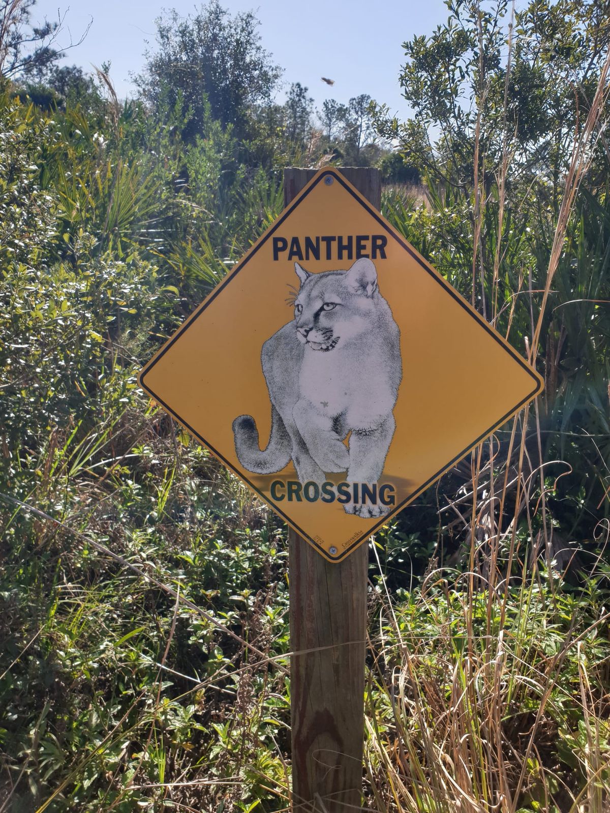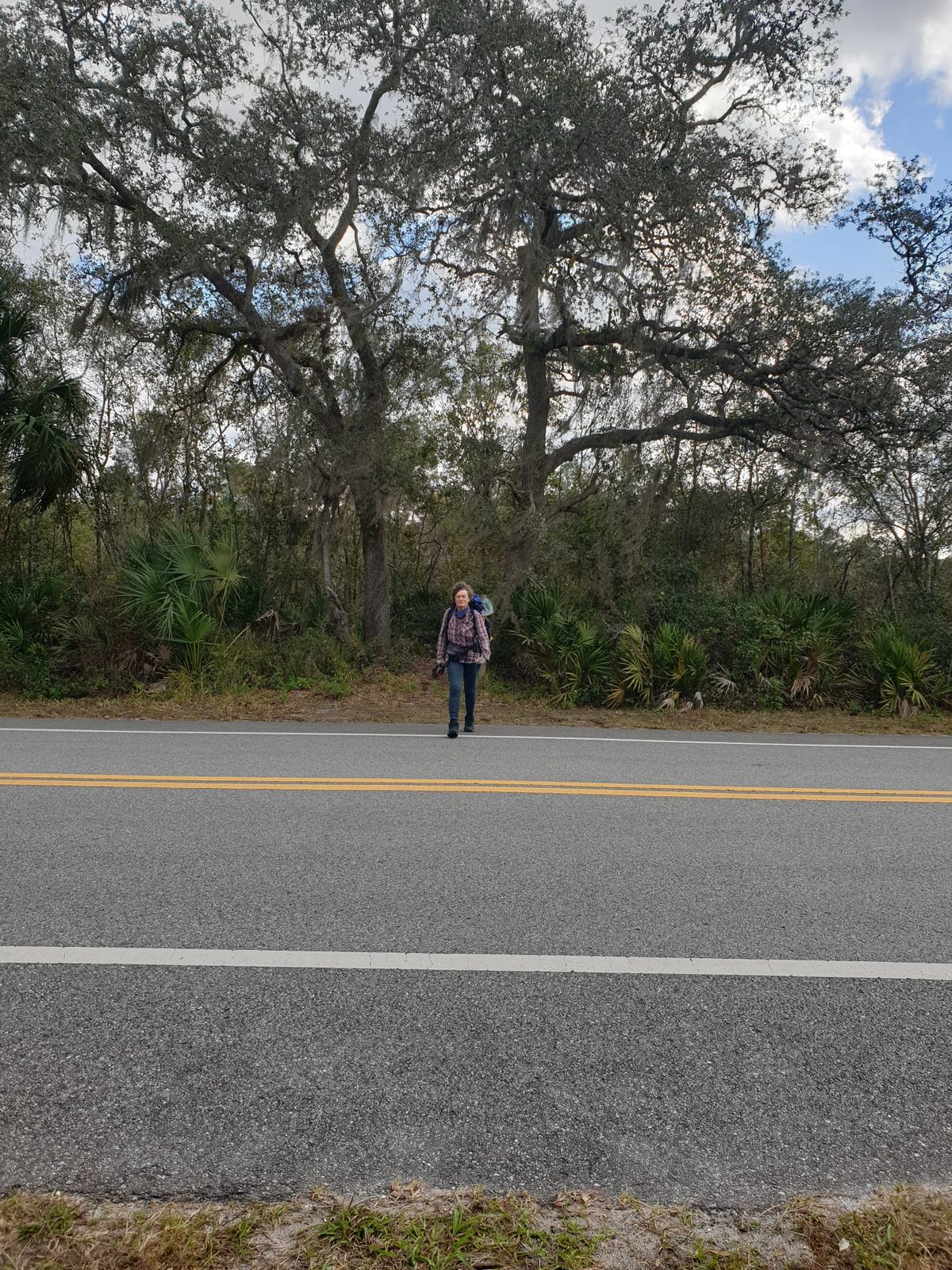 Wer sehr früh aufsteht und 40 Kilometer läuft, der ist auch abends entsprechend müde. So kommt es, dass wir schon gegen 19.00 Uhr einschlafen, obwohl unser Zelt nur 5 Meter Abstand zur Straße hat. Eine halbe Stunde morgens früh auf der Nova Road, danach verläuft unser Weg 10 Kilometer entlang der SR520. Das ist eine vierspurige Schnellstraße mit einem schmalen Grünstreifen dazwischen. Natürlich ohne Gehweg, sowas gibt es hier nicht. Unfassbar viel Verkehr, wir ziehen die Köpfe ein und laufen, so schnell wir können. Es stinkt nach Verwesung. In der Mitte zwischen den Fahrbahnen entdecken wir bald das erste Opfer. Ein stattlicher Panther liegt da. Es war mal ein sehr schönes Tier. 🙁 Weiter geht die Reihe der Verkehrstoten mit zwei Waschbären, einem Reh und einem weiteren Panther. Die ganzen anderen Kleintiere möchte ich gar nicht mehr aufzählen. Es ist wirklich deprimierend. Dazu noch die Geräuschkulisse und der Müll, der sich am Rande der Fahrbahn sammelt. Kein Schatten, kein Pausenplatz, nur schnell durch. 🙂 Nach 2,5 Stunden haben wir es geschafft. Die verhasste Straßen-Lauferei ist erstmal vorbei. Endlich zurück in die Natur. Vorher dürfen wir uns noch an einem Wasser-Depot bedienen. Gute Gelegenheit zum Kochen unseres Haferflocken-Frühstücks. Eine schmale Wegspur führt zu einem Schild. Dort steht, dass man eine bestimmte Nummer anrufen soll, wenn man hier durch möchte. Jetzt geht dieser Quatsch wieder los. 😉 Der nächste Abschnitt beginnt damit, dass wir einen Kilometer durch knietiefes Wasser müssen. Danach ein offenes Feld, der prallen Sonne ausgesetzt, und dann geht es ab zwischen die Bäume. Ein schmaler Pfad im Mischwald, zwischen Palmetto-Palmen und hohen Kiefern hindurch.