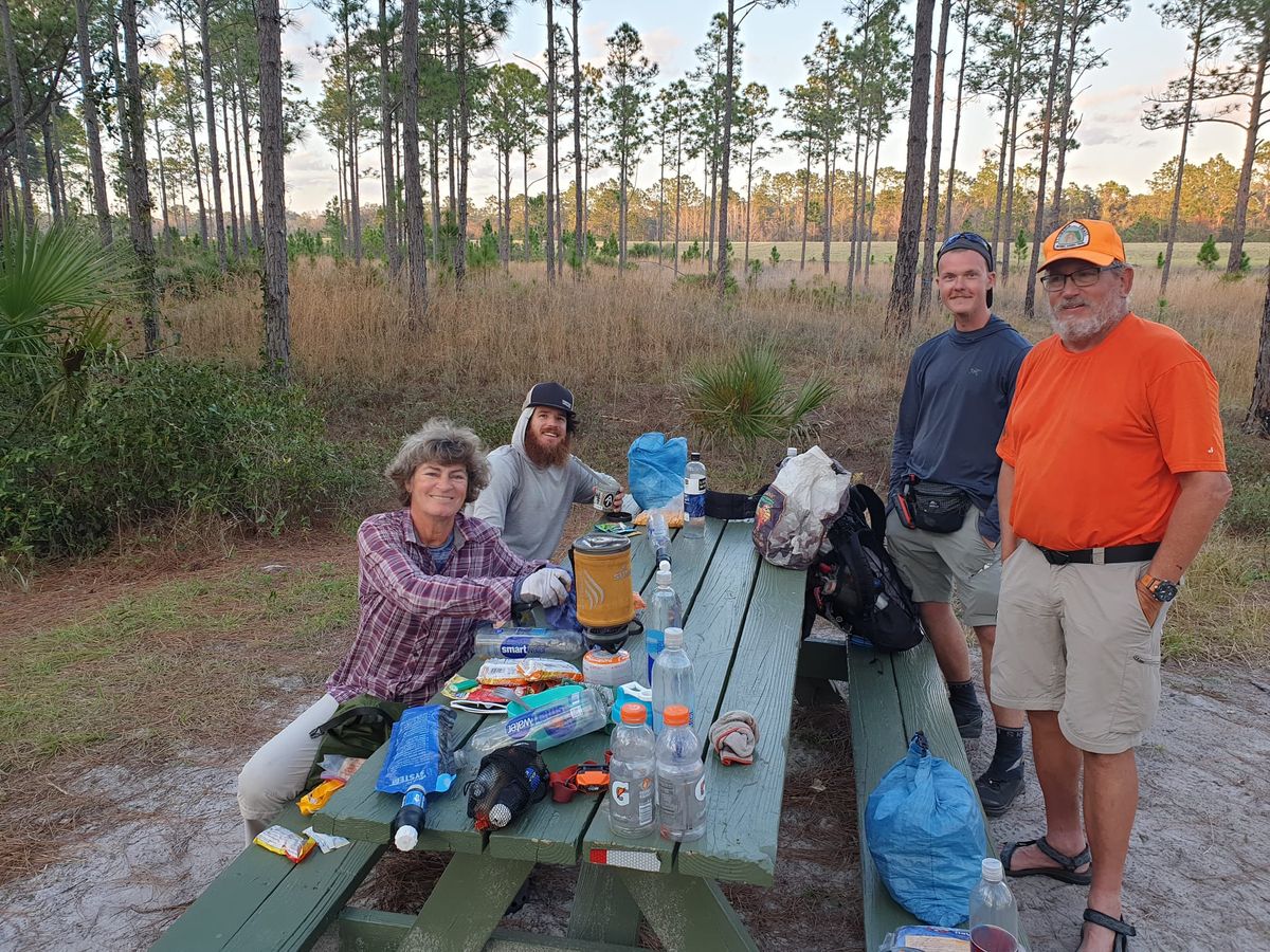 Berufsverkehr, Schulbusse und viele Lastwagen sind morgens um 7.30 Uhr unterwegs. Gürteltier, Adler, Waschbär, Opossum, Waschbär, Adler, Gürteltier …. Zum Glück dauert es nur eine Stunde, dann zweigt ein Weg ins Grüne ab. „Florida Forever“ heißt dieser Abschnitt. Am Eingang zum Trail sind einige Kanister Wasser deponiert. Sehr hilfreich, wir bedienen uns gerne. Wer in der Frühe vorne läuft, der hat das Problem mit den Spinnweben im Gesicht. Heute bin ich dran. 😉 Auf der Veranda des Visitor Centers ( wegen Pandemie geschlossen ) stehen einige Stühle. Wir finden diesen Platz sehr geeignet für unsere erste Pause und kochen Kaffee. Weiter geht es auf leicht matschigem Pfad. Vereinzelte Rehe springen durch die Prärie. Die scheinen dieses Revier zu mögen. Wilde Truthähne ein Stück voraus, da trippelt eine ganze Gruppe von 10 Vögeln. Die verschwinden allerdings um die nächste Kurve, noch bevor die Kamera im Handy startklar ist. Wir kommen an mehreren kleinen Seen vorbei, dicht zugewachsen mit Wasserpflanzen. Dort lugen hin und wieder die Köpfe von Alligatoren aus dem Wasser. Ein Tümpel liegt mitten auf unserem Weg, da müssen wir durch. Ich versuche, trockenen Fußes auf die andere Seite zu kommen, indem ich auf Baumstämmen balanciere und dicke Grasbüschel zum Drauftreten nutze. Thomas verspricht mir einen Heiermann, wenn die Schuhe trocken bleiben. Es gelingt mir nicht. Zwei tiefere Gräben sind zu durchwaten, das Wasser läuft in die Schuhe. Nachmittags durchqueren wir ein Jäger-Camp. Das hatten wir uns ganz anders vorgestellt. Die wohnen nicht in Zelten, sondern mindestens 30 Wohnmobile stehen hier. Zur Zeit wird fleißig Jagd auf Wildschweine gemacht. Wir dürfen es uns am Picknick-Tisch gemütlich machen und Wasser mitnehmen. Eine Dame, die offensichtlich irgendeine Funktion hat, bietet uns sogar an, das Badezimmer im Wohnwagen zu benutzen. Sehr nett. Warmes Wasser, wohlriechende Seife und Papiertücher zum Abtrocknen. Wir freuen uns über die unerwartete Möglichkeit zum Waschen von Händen und Gesicht. Ein Bekannter kommt mit zügigem Schritt näher, gerade als wir uns von den Jägern verabschieden. Es ist „Punisher“, den wir kürzlich beim Country Store kennengelernt haben. Zwischenzeitlich hat das junge Paar einige Tage bei der Familie verbracht, seine Freundin ist jetzt zu Hause geblieben. Wir laufen ein Stückchen gemeinsam, aber der ist uns zu schnell, er könnte unser Sohn sein. Hübsche Singvögel mit zitronengelbem Bauch begleiten uns ein Weilchen. Unser Zeltplatz ist noch 5 Kilometer entfernt, dafür brauchen wir in diesem Gelände 1,5 Stunden. Am „Jane Green Campsite“ teilen wir uns zum ersten Mal Tisch und Lagerplatz mit anderen Hikern. Das liegt daran, dass es die letzte legale Möglichkeit zum Campen ist, bevor wir morgen einen 50-Kilometer-Marsch entlang der Straße beginnen. Punisher hat sein Zelt bereits aufgebaut, außerdem der Holländer „Tin Man“ und „Orange Blazer“, der hier aus der Gegend stammt. Gesellige Runde beim Essen. Das sind wir gar nicht gewöhnt, aber es ist interessant. Alle sind schon um 18.30 Uhr im Zelt verschwunden, wie es sich für anständige Langstrecken-Wanderer gehört. Wir sind gut gelaufen, 36 Kilometer weiter – reicht.