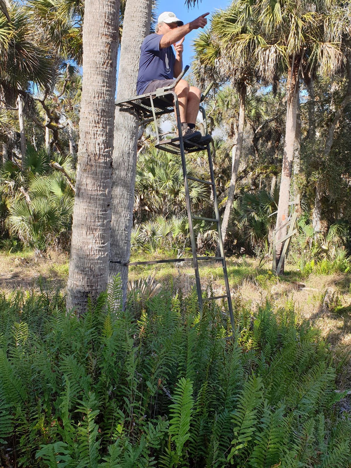 Unser freier Tag ist gut gewählt. Montag Nachmittag zieht ein heftiges Gewitter durch. Landunter. Wir können froh sein, dass wir nicht unterwegs sind, sondern uns diese Wassermassen aus dem Zimmer ansehen dürfen. Im Supermarkt steht eine Personenwaage. Klar steigen wir da drauf, das wird spannend. Also nicht unser jetziges Gewicht ist interessant, sondern ob und wie viel wir in den nächsten Monaten verlieren. Der Abstand zwischen 1. und 2. Impfung passt, danach ist ein ganzer Ruhetag im Hotel geplant, und am Dienstag starten wir nur mit einer halben Distanz. Thomas quatscht ein paar Leute in der Nachbarschaft an und organisiert Jemanden, der uns zurück zum Trail bringt. Keine Lust zum Trampen, da wir auf dem Hinweg geschlagene 3 Stunden auf eine Mitfahr-Gelegenheit warten mussten. Ein Opa ohne Zähne fährt uns gerne. Er bekommt 40,- US$ auf die Hand und freut sich. Durch den gestrigen Regen hat es sich etwas abgekühlt, worüber wir froh sind. Durchschnittliche Tages-Tempetatur 19° Celsius, das nennen die hier „Kaltfront“. Sonne, leichter Wind, sehr angenehm. Wir laufen durch Prärie, wie schon im State Park, aber ohne dafür eine Genehmigung einholen zu müssen. Auf dem heutigen Abschnitt ist die Spur nicht mit dem Lineal gezogen. Saftiges Grün, Palmetto-Palmen zu beiden Seiten, soweit das Auge reicht. Der Weg ist matschig, dafür aber Natur pur und einsam. In regelmäßigen Abständen ist ein Streifen gerodet. Das sind Feuer-Barrieren, denn wenn es in der Prärie brennt, dann kann sich das Feuer nicht darüber hinaus ausbreiten. Thomas klettert auf einen Jäger-Hochstand. Unter dem Baum wohnt eine Schlange, die flink in die hohlen Metallröhre der Leiter verschwindet. An die Prärie schließt sich ein Waldstück mit urwüchsigen Bäumen an. Florida-Trail heute in schön, wir können gar nicht meckern. Feierabend bereits vor Sonnenuntergang, es lockt ein Zeltplatz auf weichem Laub.