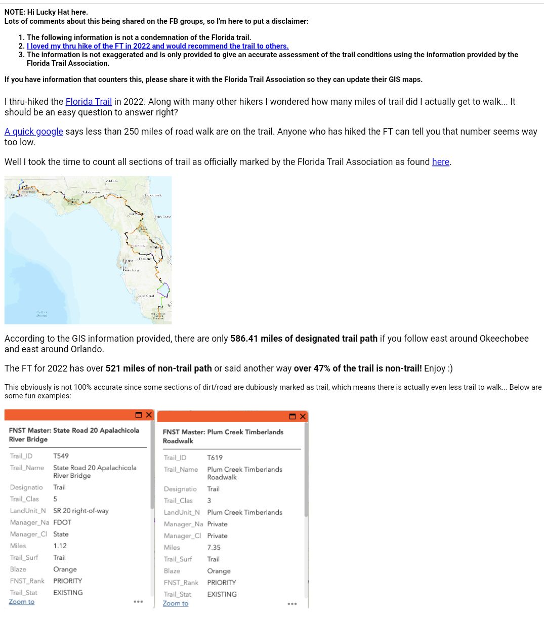 Der Florida-Trail bekommt von uns keine Empfehlung als Long-Trail. Die Bezeichnung als „National Scenic Trail“ können wir ebenfalls nicht verstehen. Tatsächlich läuft man mehr als ein Drittel der Gesamtstrecke auf Asphalt, und damit sind nur die großen und gefährlichen Straßen erfasst. Was ist daran „scenic“ ? Lucky Hat, der den Weg zur selben Zeit gemacht hat, kommt sogar auf beinahe 50 % „non-trail“ = kein Wanderweg. Alles ist Definitionssache. Es scheint so, als wären die „Macher“ dieses National Scenic Trails das ganze Ding nie selber gelaufen. Fakt ist, dass auch asphaltierte Fahrradwege neben dem Highway die Füße quälen. Mit unseren Shin Splints und anderen Blessuren stehen wir nicht alleine da, über dieselben Probleme haben auch viele Mitstreiter geklagt. Wir haben den Eindruck gehabt, dass man jedes schöne Stück mit einer doppelt so langen hässlichen Etappe „bezahlen“ muss. 🙁 Natürlich hat auch der Florida-Trail einige lohnenswerte Abschnitte, die wir nachstehend aufführen.
