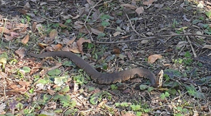 Unser Not-Camp an der Straßenecke ist viel besser als erwartet. Lange Nachtruhe, Kaffee-Trinken im Zelt, später Start. Wir möchten nur eine kurze Etappe laufen, also wieder etwa 20 Kilometer. Spruch des Tages von Thomas : „Woran merkt man, dass man auf dem falschen Trail ist ? Wenn man morgens früh an eine Tankstelle kommt und gar nicht weiß, was man kaufen möchte.“ 😉 Im Ernst …. So geht es uns auf dem Florida-Trail. Wir sind viel zu gut in der Versorgung und haben gar nicht diesen Heißhunger auf spezielle Dinge, weil wir eigentlich auf nichts lange verzichten müssen. Seit drei Wochen etwa kommen wir gar nicht mehr richtig raus aus der Zivilisation, haben ungefähr jeden zweiten Tag einen Imbiss oder eine Einkaufs-Möglichkeit auf dem Weg. Das ist zum Teil gut, weil wir nicht viel Proviant tragen müssen, aber es nimmt uns auch einen großen Teil des Long-Trail-Gefühls. Drei Kilometer Straße, dann die erste Pause an einer Tankstelle. Dort lernen wir „Lambo“ kennen, der einen Thru-Hike von Süden nach Norden macht. Genau wie wir, aber wir werden gerade locker überholt. Er läuft erst seit drei Wochen, wir alten Leute 😉 sind jetzt schon die fünfte Woche unterwegs. Lambo stammt aus Littauen, hat acht Jahre auf Hawaii gelebt und ist seit 13 Jahren in den USA. Pandemie-bedingt hat Lambo wenig Arbeit und viel Zeit, dieser junge Mann hat die Chance für sich genutzt. Er macht das Beste draus und läuft gerade seinen dritten Long-Trail in den USA. 🙂 Nach weiteren 8 Kilometern sitzen wir in Hampton an der nächsten Tankstelle, wo wir auch Lambo noch einmal treffen. Der Palatka-Lake Butler-Trail verläuft auf einer ehemaligen Eisenbahn-Strecke. Viele Kilometer lang wandern wir auf einer breiten Fahrspur voller Unkraut und Unebenheiten. Wir staunen nicht schlecht, als uns auf diesem Weg ein Wagen entgegen kommt. Es handelt sich um ein Polaris UTV, ein Multi-Funktionsfahrzeug, das oft für die Landwirtschaft gebraucht wird. Darin sitzen drei Kinder, ungefähr 10-12 Jahre jung, kein Erwachsener. Natürlich ist das nicht erlaubt, selbst in den USA nicht. Der Palatka-Lake Butler-Trail ist keine private Straße, und am Anfang stand ein deutliches Verkehrsschild „No motorized vehicels“. Aber in Florida ist alles möglich, solange man sich nicht erwischen lässt. Die Sonne scheint und wärmt ein bisschen. Das haben wohl auch die Reptilien bemerkt, denn eine ca. einen Meter lange Schlange liegt mitten auf dem Trail. Ich habe sie überhaupt nicht gesehen. Ziemlich dick, oben ganz dunkelbraun wie ein Ast, die Unterseite ist gemustert. Die Schlange hebt ihren Kopf und zischelt mich an, während ich schon so gut wie vorbei bin. Es handelt sich um eine Wasser-Mokassinotter. Davor wurden wir ausdrücklich gewarnt, denn die sind giftig. Bei Gefahr stellen sie sich auf und öffnen das Maul, um Angreifer zu warnen. Dieses Verhalten wirkt sehr aggressiv, ist aber zunächst nur eine Drohgebärde. Thomas knipst ein paar Fotos und macht einen Bogen in respektvollem Abstand.