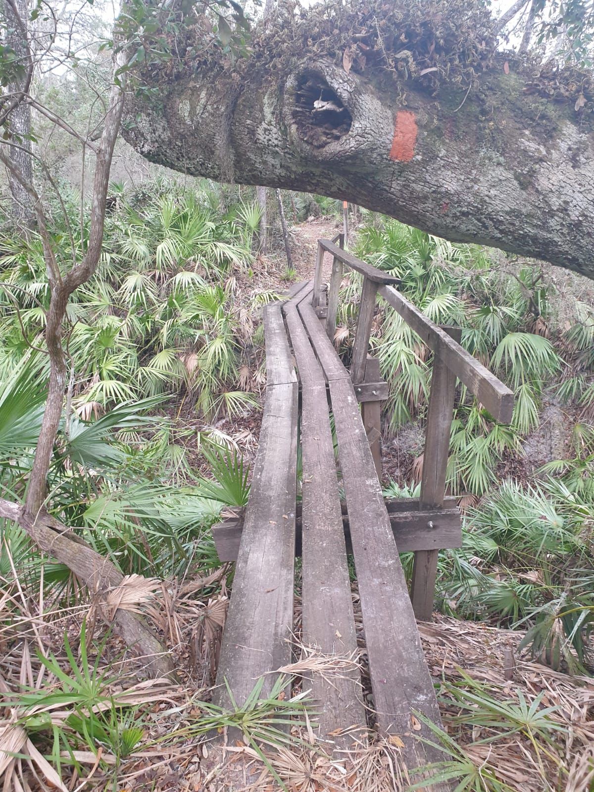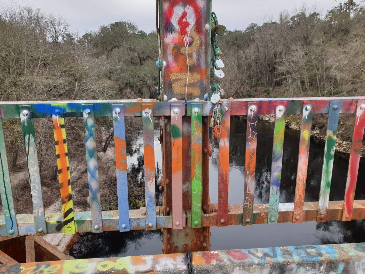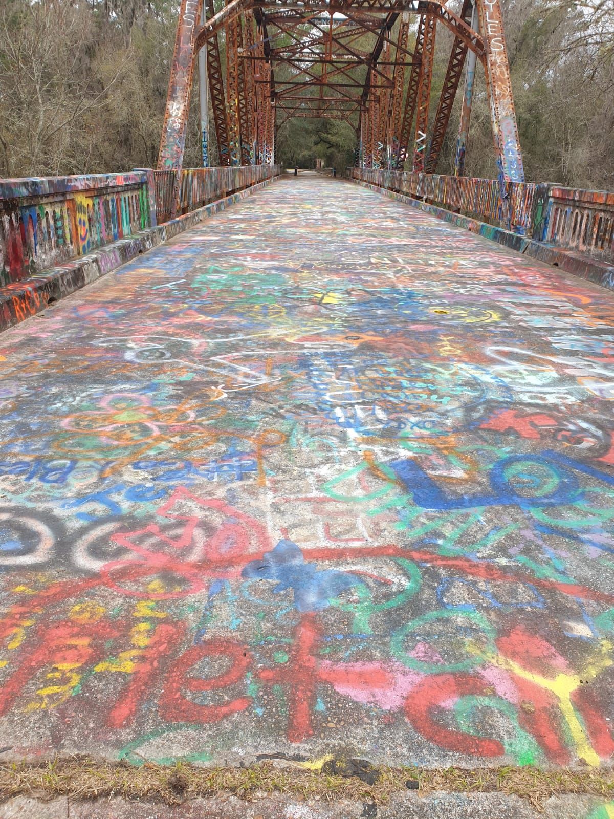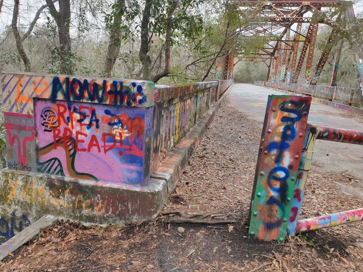 Ohne Kaffee haben wir innerhalb einer Viertelstunde das Zelt abgebaut und unsere Rucksäcke gepackt. Gleich nach dem Start geht es abwärts. Unten im Einschnitt fließt ein Bach mit kristallklarem Wasser. Auf einem Baumstamm balancieren wir auf die andere Seite. Es folgt ein steiler Anstieg, also steil für Florida-Verhältnisse. 😉 Eine Weile führt der Trail oben auf der Böschung weiter, immer mit Blick auf den Fluss zwischen Wänden aus Sandstein. Dann geht es den Hügel wieder hinunter, noch einmal auf einem morschen Balken über einen Zulauf und vorbei an einer breiten Sandbank. Der Weg um den Suwannee River ist wirklich schön, leider spielt das Wetter nicht so richtig mit. Nach zwei Stunden erreichen wir die Kreuzung, an der wir vom Trail ausscheren wollen. Eine Brücke unter dem Highway ist farbenfroh bemalt. Die Old US129 Bridge wird „Hippie-Brücke“ genannt. Da waren viele kreative Menschen am Werk. Uns gefällt die bunte Graffiti, es wirkt fröhlich und macht gute Laune.