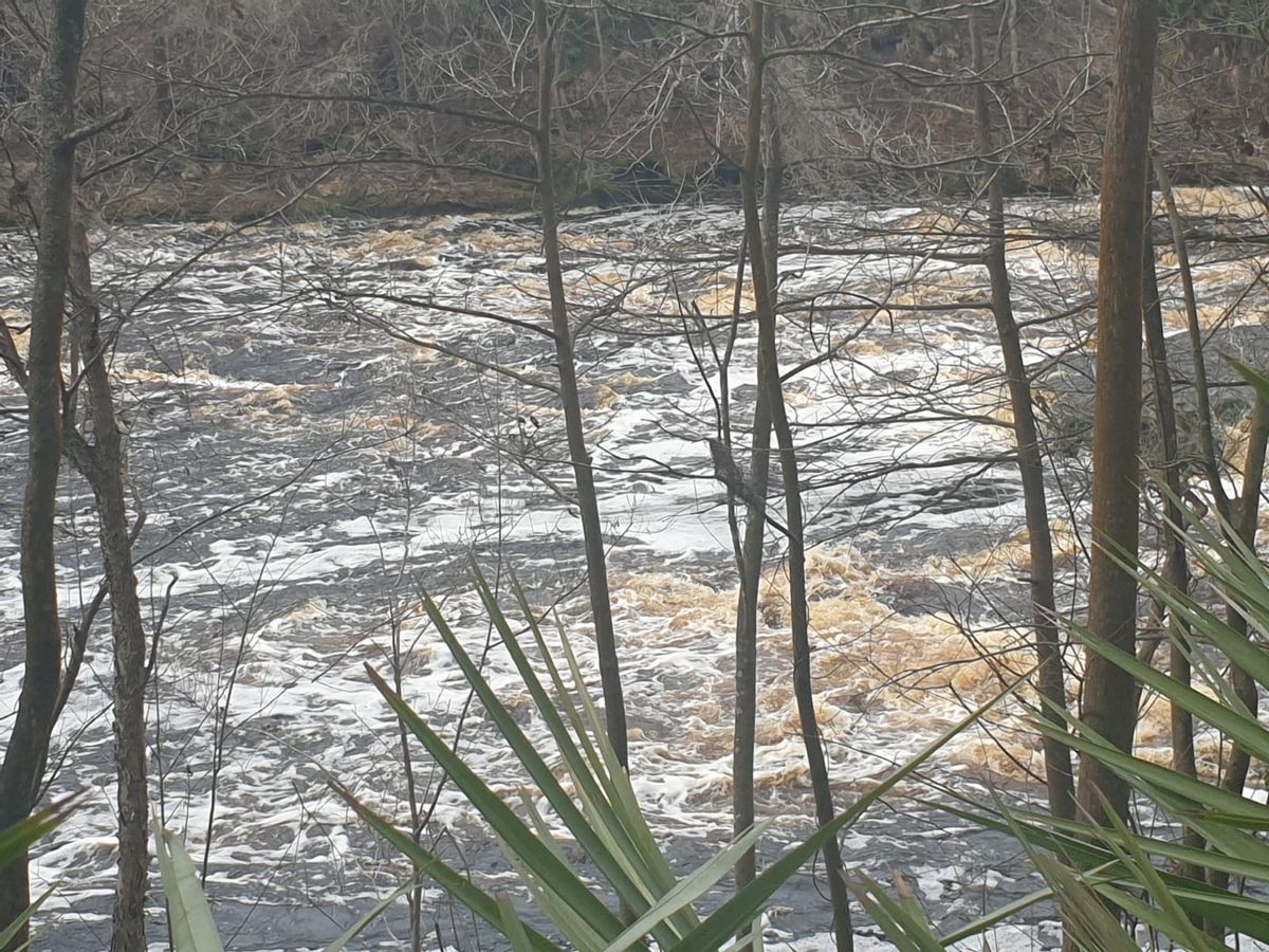 Der Osceola National Forest ist der kleinste der drei National Forests. Nur noch eine Stunde am frühen Morgen, dann sind wir raus. Schöner Mischwald. Der Pfad ist ein bisschen matschig, aber die Schuhe bleiben weitgehend trocken. Unterwegs sehen wir Campingplätze ohne Ende …. also den Umweg gestern Abend hätten wir uns sparen können. Am Deep Creek Trailhead ist Ende dieser Sektion, wir können die neue Karte laden. Nach dem Osceola laufen wir über Straßen bis Milton’s Country Store. Sehr freundliche Bedienung, es gibt Frühstück nach guter Hausfrauen-Art. Internet funktioniert nicht. Schade. Wir dürfen unser Handy an der Steckdose laden und ziehen danach gut gestärkt weiter. Straße, Straße, Straße ….. Dann endlich führt uns der Florida-Trail zurück in die Natur. Die neue Sektion heißt „Suwannee River“. Was für eine tolle Landschaft ! 🙂 Satt-grüne Palmetto-Palmen stehen hier in voller Pracht. Die sind nicht vertrocknet oder erfroren, sondern sehen wunderbar gesund aus. Unser Pfad windet sich entlang des Suwannee River, mal auf der einen und mal auf der anderen Seite des Flusses. Abenteuerliche Holzbrücken erleichtern den Seitenwechsel. Man hört sie schon von Weitem : Stromschnellen der Stärke 3. Das Wasser brodelt. Hier treffen wir auf zwei Männer, die mit ihren Kanus im Bundesstaat Georgia gestartet sind. An dieser Stelle tragen sie ihre Kanus und ihre Ausrüstung, bis sie ausreichend Abstand von den Stromschnellen haben.