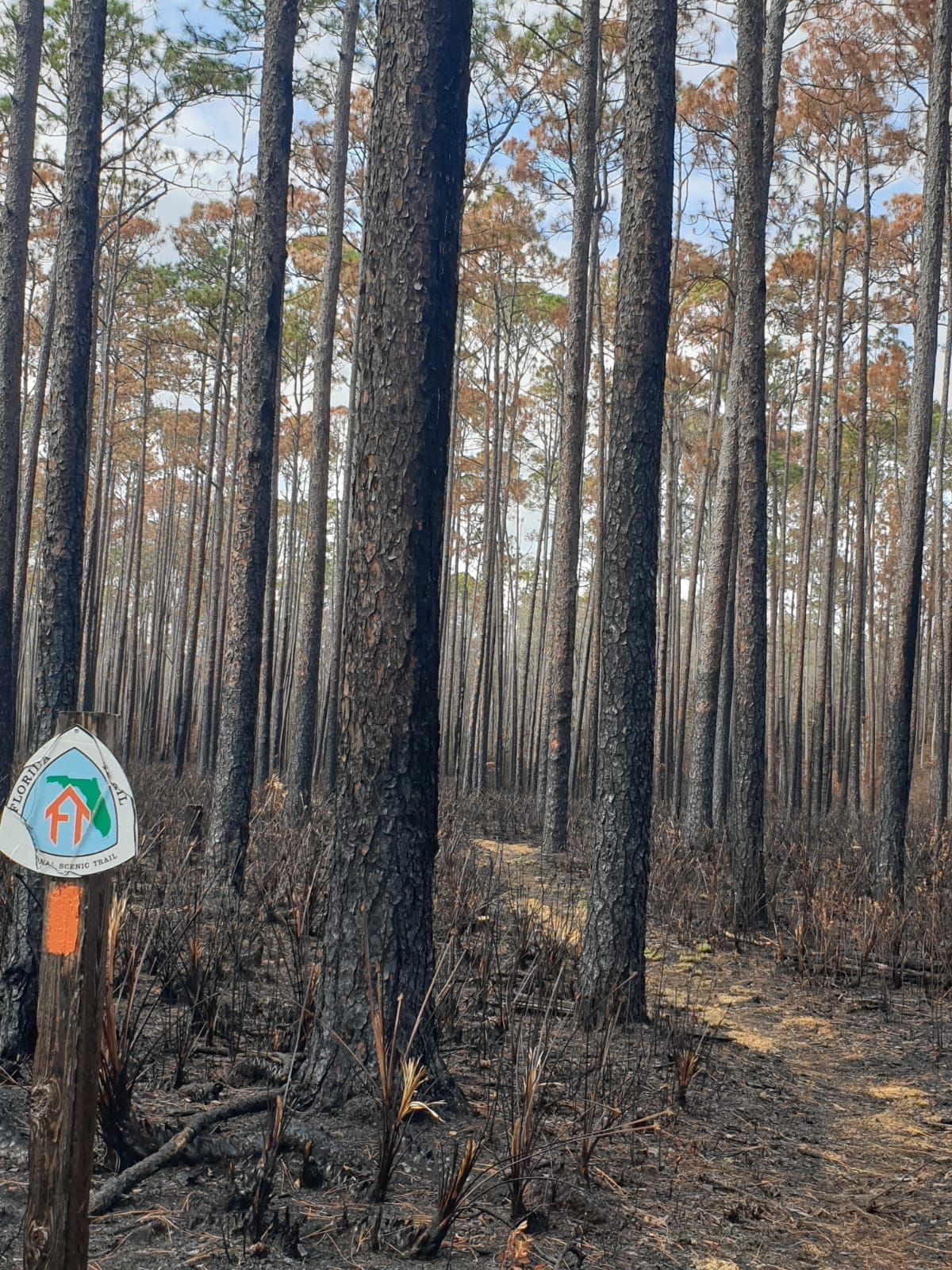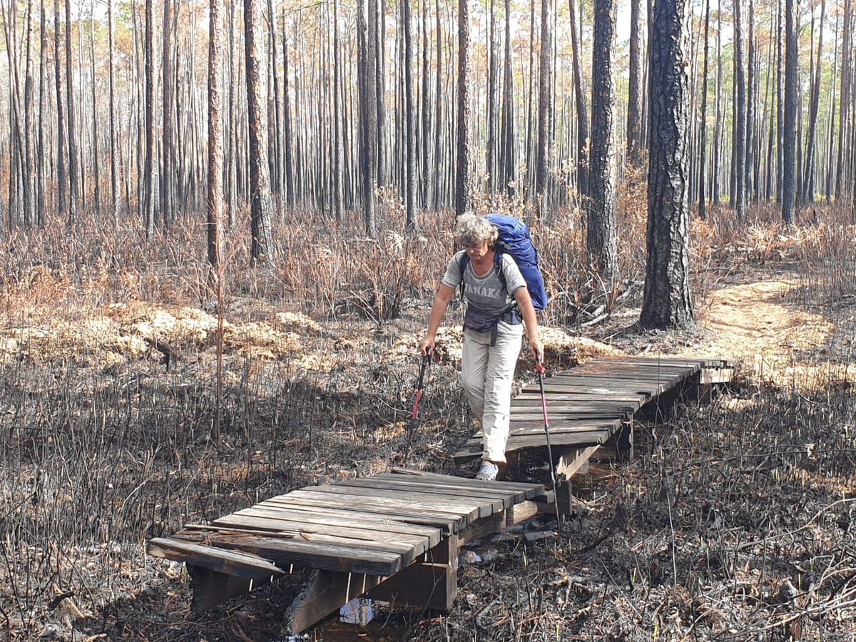 Danach bekommen wir noch richtig Spaß. Der Trail ist feucht und matschig, oft steht das Wasser knöcheltief. Es folgt eine Passage, die man eigentlich nicht gehen sollte. In unserem Handbuch steht, dass es dort eine Umleitung gibt. Wir verpassen diese Abzweigung und sind plötzlich mitten drin. Ein großes Wasserloch können wir durch Balancieren am Rand entlang umgehen. Kurz darauf steht der Trail wieder komplett unter Wasser, es sieht sogar ziemlich tief aus. Wir turnen außen herum, nur ein Fuß landet im Matsch. Die nächste Wasserstelle blockiert uns in voller Breite, da gibt es kein Ausweichen. Thomas hat eine kurze Hose an, er stapft ohne Zögern mit seinen Schuhen durch. Ich krempele die Hose bis zum Knie hoch, ziehe meine Strümpfe aus und laufe barfuß in Crocs. Eine halbe Stunde bleibt der Weg gut. Ich habe gerade die Socken wieder angezogen, da stehen wir erneut vor einem ausgiebigen Schlammloch. Also durch, ab jetzt brauchen wir gar nicht mehr aufpassen. Auch im weiteren Verlauf wären die Schuhe nicht trocken geblieben, denn das Moos ist vollgesogen mit Wasser. Im Sumpf zwischen hohen Cypressen steht ein „Wood Stork“, ein Wald-Storch. Er ist die einzige Storchenart, die auch in Nordamerika brütet und ist dort der größte Schreitvogel. Lange Zeit galt er in den USA als bedrohte Vogelart, seit 2014 gilt sie nur noch als gefährdet. Der Storch erhebt sich elegant und fliegt zwischen den Stämmen hindurch davon. Erstaunlich, dass er nirgends anstößt mit seiner großen Flügel-Spannweite. Am Nachmittag durchqueren wir eine verbrannte Region, wo überhaupt kein neues Grün sprießt. Das Feuer scheint noch nicht lange her zu sein, es riecht verkohlt. Und es kommt uns so vor, als wäre es keine gewollte Brand-Rodung, sondern außer Kontrolle geraten. Das Gebiet ist ziemlich ausgedehnt, und beide Seiten des Trails sind betroffen. Mehrere Holzbrücken über dem Sumpf sind angekokelt, oder ganze Elemente fehlen. Das kann doch keine Absicht gewesen sein.