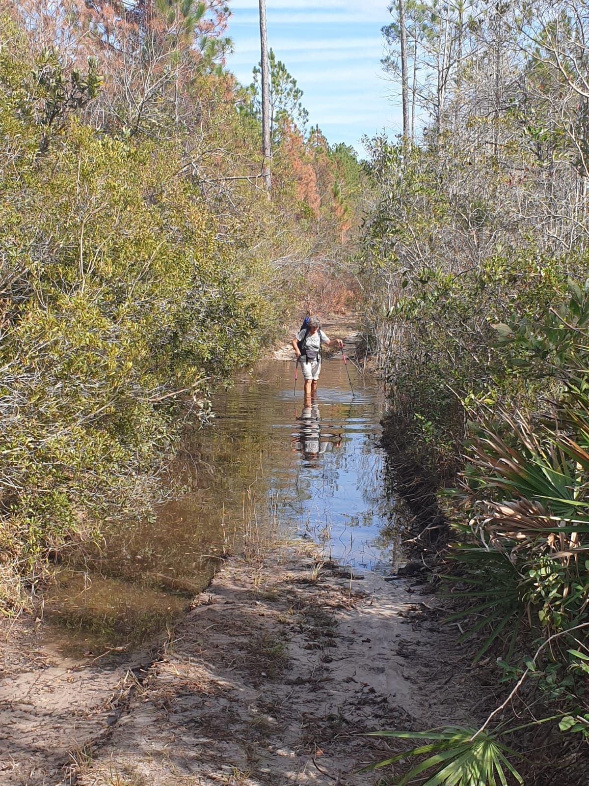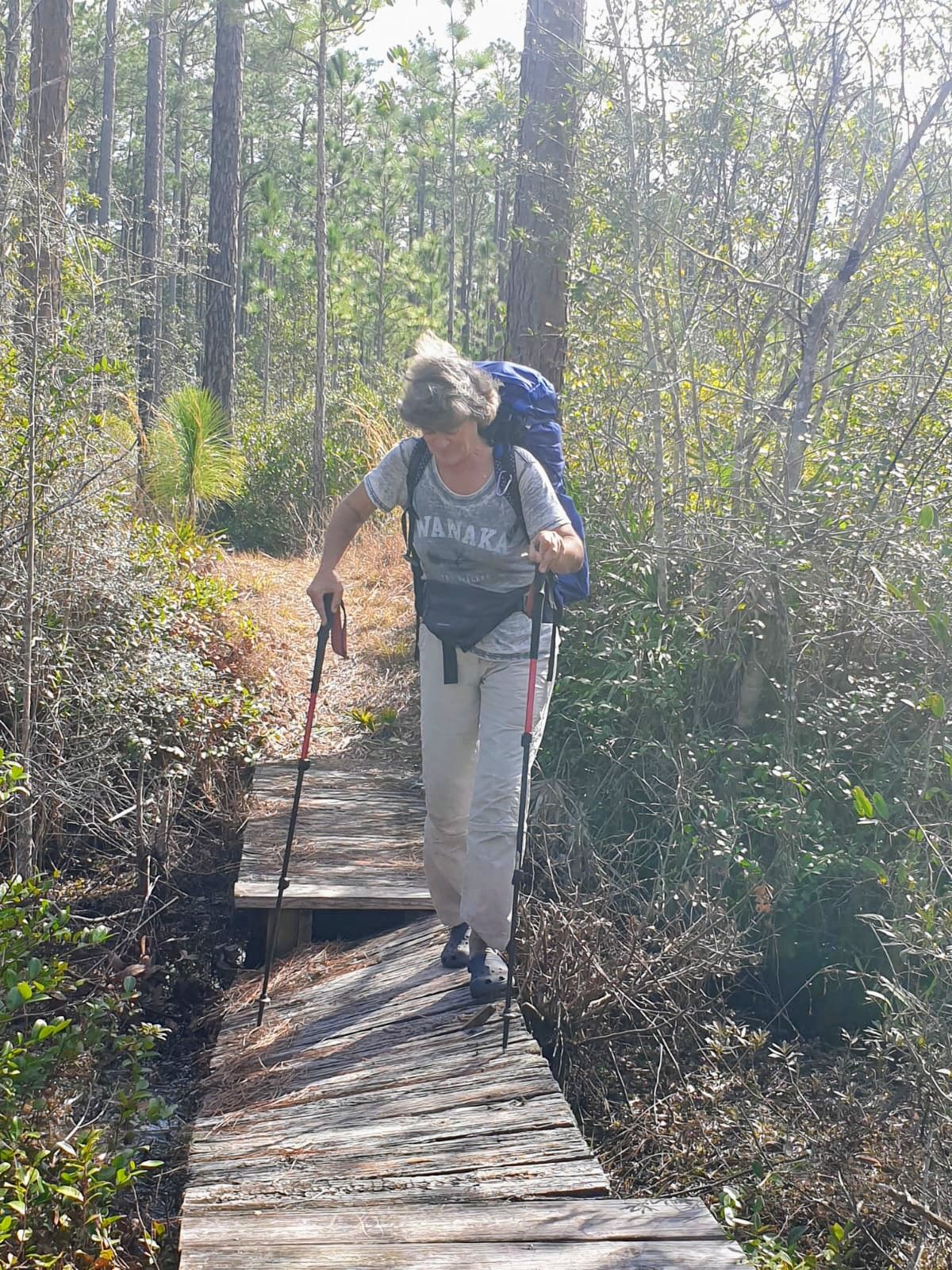 Kurz darauf müssen wir über eine Art Schwebebalken balancieren, erinnert an den Turn-Unterricht. Nun wissen wir auch, warum man eigentlich nicht durch dieses Stück wandern sollte. Auf jeden Fall ein richtiger Trail und noch nicht aufgeräumt. Für uns ist es ein sehr abwechslungsreicher Nachmittag, wir finden solche unerwarteten Hindernisse immer spannend. Abendessen beim West Tower Camp, wo uns aber zu viel los ist. Dauer-Camper, Jäger, lautes Hundegebell, hier sollen auch die „verdächtigen Gestalten“ wohnen. Wir marschieren noch ein Stündchen weiter. Über die Hälfte des Weges hören wir die bekloppten Hunde kläffen und sind froh, dass wir uns entfernen. Die Schuhe werden auf’s Neue nass. Knöcheltiefer Matsch auf den letzten Metern. Durch einen Kommentar in unserer Handy-App finden wir ein trockenes Stück Wiese für unser Nachtlager. Ein Kilometer abseits des Trails, aber der Umweg lohnt sich für einen guten Platz. Ich opfere einen Liter von unserem Kaffee-Wasser zum Füßewaschen, morgen wird es dann nur einen Kaffee geben. Es ist wärmer geworden, und wir stecken mitten im Sumpfgebiet. Ein paar Moskitos haben die Kälte überlebt und produzieren gleich wieder Stress. Beim Zähneputzen kassiere ich etwa ein Dutzend Stiche. 29 Kilometer geschafft, jeden Tag etwas mehr, leichte Schwellung, aber keine Schmerzen. Ich bin wieder den ganzen Tag mit meinen Crocs gelaufen und habe die dicken Wanderschuhe im Rucksack getragen. Unsere Reise von Süd nach Nord ist fertig. Wir machen jetzt einen Winkel von 90° und laufen die zweite Hälfte von Ost nach West bis nach Pensacola, nahe der Grenze zu Alabama.