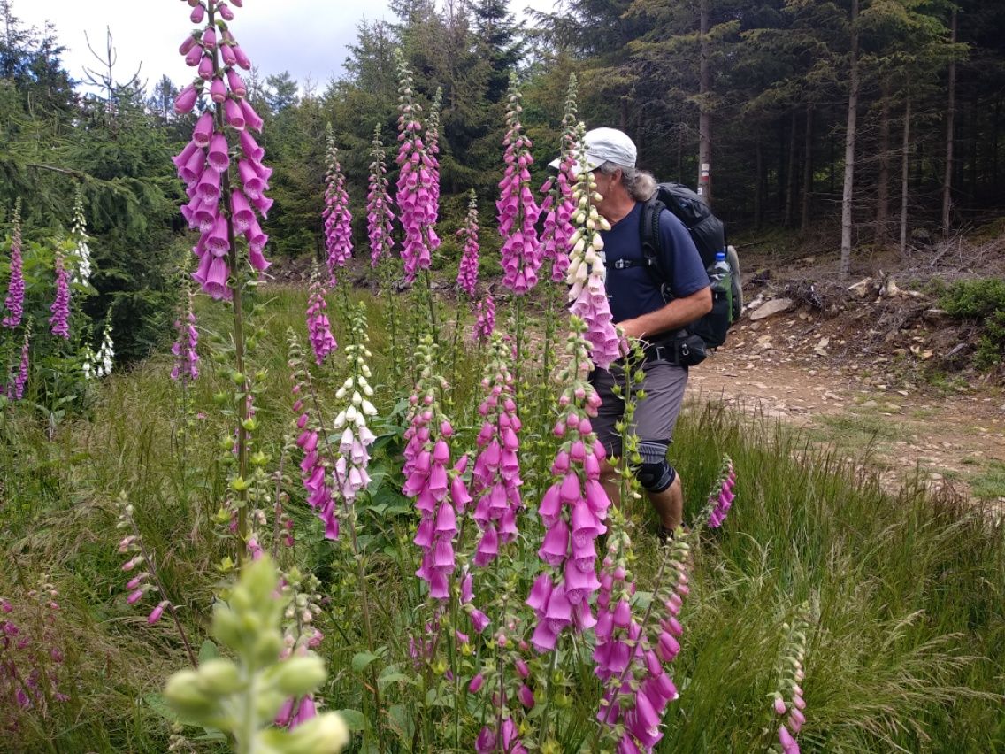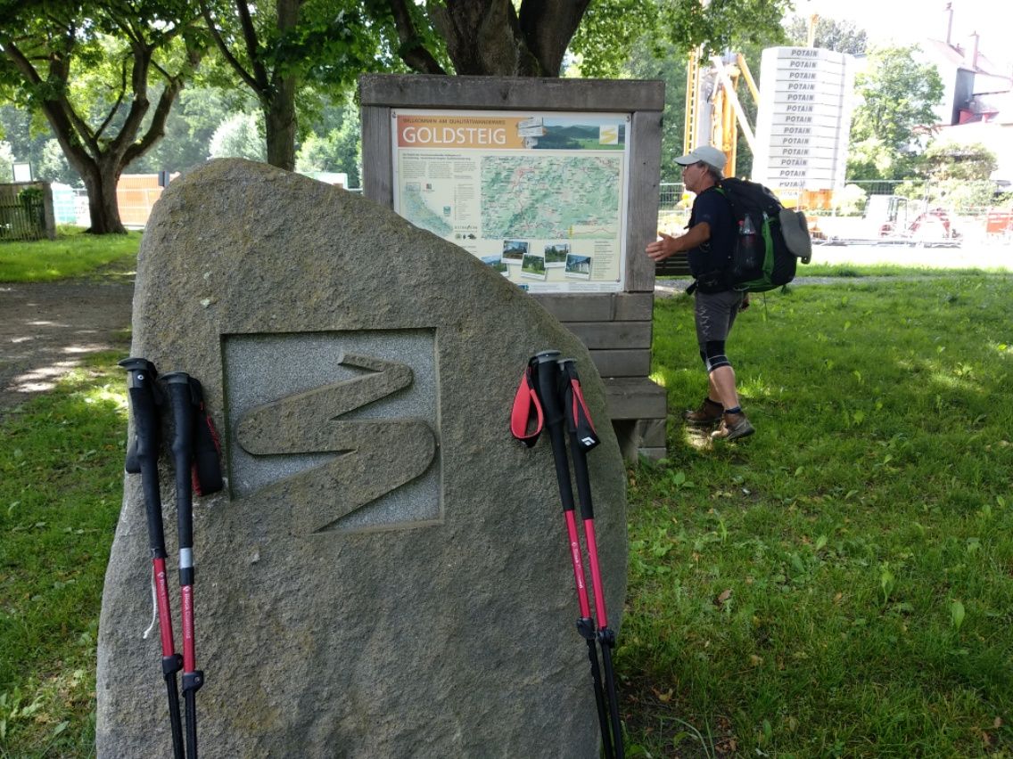Tag 5 auf dem Goldsteig beginnt mit einem Aufstieg auf den Schlossberg, wo zahlreiche Bänke mit schöner Aussicht zur Kaffeepause einladen. Weiter geht es auf dem Geologischen Lehrpfad. Dort stehen Granitblöcke in unterschiedlichen Größen und Farben, naturbelassen oder bearbeitet und glatt geschliffen. Tiefe Mulden mit durchgepflügter Erde sind ganz deutliche Anzeichen für Wildschweine. Gesehen haben wir bisher noch keine. Mini-Frösche von nur 1-2 Zentimeter Größe hüpfen auf dem Weg. Wir könnten eine Dusche und einen Ruhetag gebrauchen. Ein sauberer Rastplatz mit Bänken bietet sich an, um einen Ort zum Übernachten zu suchen. Die Entfernungen passen alle nicht optimal, aber schließlich finden und buchen wir ein Zimmer in Oberviechtach. Kurz vor dem Ort befindet sich die Jakobikirche. Die Einrichtung ist schlicht, aber hell und freundlich. Ich hinterlasse einen Eintrag im ausgelegten Gästebuch. Nach gut 20 Kilometern erreichen wir die Pension Weigl, wo wir uns mit der weiteren Planung beschäftigen müssen. Ein Ausstieg vom Trail ist geplant, weil wir zu einer Feier nach Marburg fahren werden. Komplizierter als erwartet, denn die Bahnverbindungen von unserer einsamen Nordroute aus sind schlecht. Wir werden das Tempo reduzieren und auf einer Alternative bis nach Zwiesel laufen. Die Strecke dorthin ist etwas kurz, die Distanz entspricht nicht unseren gewohnten Tagesetappen, so dass wir in der nächsten Zeit entspanntes Laufen haben. Bisher sind wir 130 Kilometer auf dem Goldsteig unterwegs und befinden uns am Ende der Etappe 7. Dem Knie von Thomas geht es erstaunlich gut. 🙂