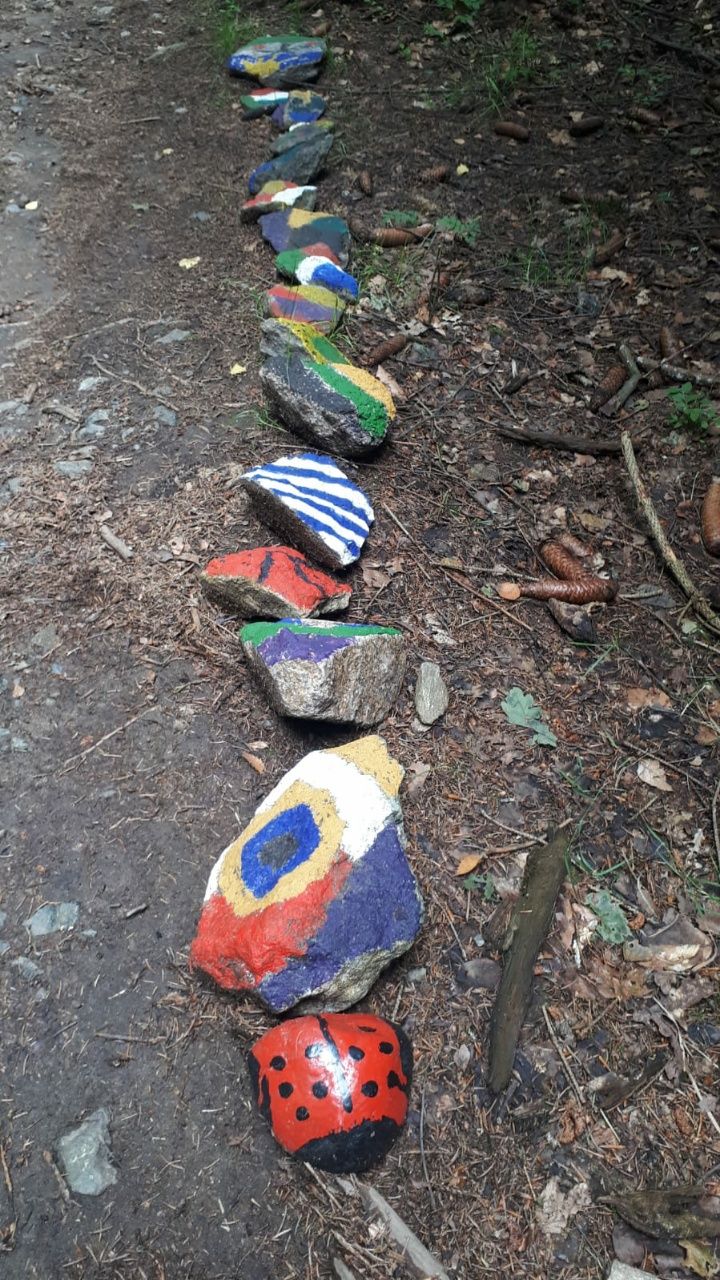 Letzte Nacht Gewitter, Blitz, Donner und viel Regen. Morgens ist die Wiese floddernass, es tropft von den Bäumen. Ein Reh spaziert über die Lichtung. Bei der erstbesten Bank gibt es erst einmal Kaffee und Kekse. Von da an führt der Weg stetig hinauf und hinunter durch dichten Wald. Es fängt schon wieder an zu regnen, heute ist kein Wetter für lange Pausen. Die Schutzhütten auf dem Goldsteig haben alle geschlossen, was vermutlich Corona-bedingt ist. Nach gut einer Stunde erreichen wir ein Gasthaus. Wir sind nass und kalt, also nichts wie hinein. Um 11.00 Uhr gibt es Schweinebraten, Knödel, Salat, Bauernschnitzel mit Kroketten zum Frühstück. Man gönnt sich ja sonst nichts. 😉 Nach dieser Stärkung folgen wir einem schmalen Pfad entlang des Flusses Pfreimd. Der Weg geht über in einen Kreuzweg über den Kalvarienberg. Für Pilger wurde hier eine Nachahmung der „Via Dolorosa“ inszeniert. Viele bunt bemalte Steine liegen in einer Reihe am Waldrand, einer schöner als der andere. Daran haben wir mehr Spaß als an den vielen Kreuzen, die schon fast ein bisschen bedrückend wirken. Auf einem Schild etliche Kilometer zurück haben wir Werbung für den Dorfladen in Trausnitz gesegen. Wir beeilen uns und erreichen ihn eine Stunde vor Ladenschluss. Kleiner Einkauf, Pause auf der Terrasse des Ladens, wo wir auch unser Zelt trocknen können. Auf der Straße liegt ein Maulwurf, der leider Pech gehabt hat. Das Tierchen war einmal sehr hübsch, nun ist es leider mausetot. Thomas entdeckt eine Echse im Gebüsch, erstaunlich groß, ca. 20 Zentimeter lang. Zwei Hasen und ein weiteres Reh kreuzen unseren Weg.
