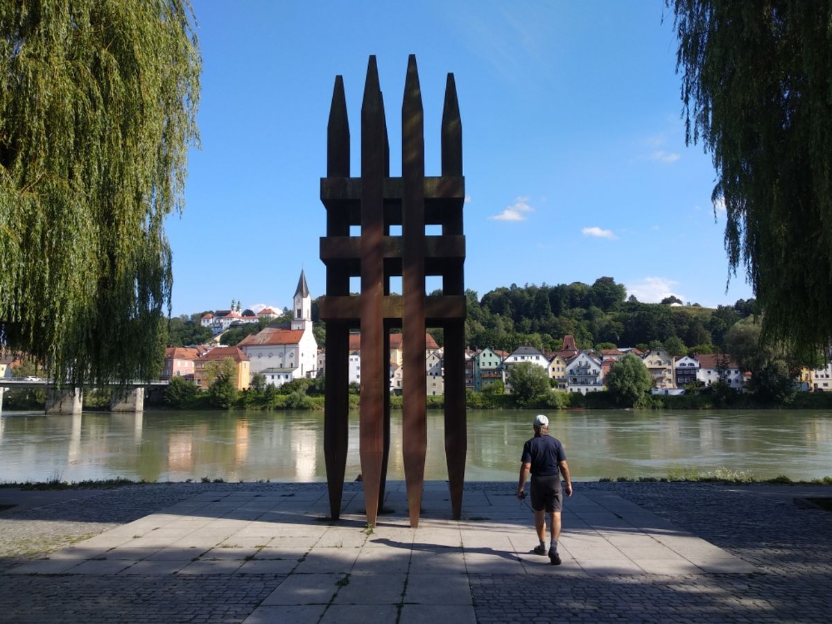 Geschafft ! Kein Regen mehr in der Nacht, Sonnenstrahlen scheinen ins Zelt, das Tief ist anscheinend durch. Alles ist trocken, der Poncho kann heute im Rucksack bleiben. Da sieht die Welt doch gleich ganz anders aus, wenn man draußen lebt. Durch die schlechten Witterungsbedingungen sind wir in den letzten Tagen zu schnell gelaufen. Nun haben wir wieder Zeit übrig, wenn das mit unserem Aufenthalt in Passau und der gebuchten Bahnfahrt gut hinkommen soll. Deswegen machen wir bereits um 11.00 Uhr eine lange Rast in Sonnen. Direkt vor dem Rathaus, neben der Kirche, stehen Bänke mit Picknick-Tisch in einem kleinen Park. Einen kleinen Einkaufsladen gibt es gleich um die Ecke, alles Faktoren für eine perfekte Frühstückspause. Gleich hinter dem Ort passieren wir ein Kreuz, daneben eine Metallplatte mit eingraviertem Text. Es handelt sich um ein Mahnmal für einen 10-jährigen Jungen, der am 1. März 1945 an dieser Stelle von einer Panzerfaust getroffen den Tod fand. Tragisch – so kurz vor Beendigung des Zweiten Weltkrieges. Nur wenige Kilometer weiter stehen wir vor einem dicken Felsbrocken, dessen Inschrift vier jungen Einheimischen gewidmet ist, die hier ebenfalls im 2. Weltkrieg bei einem Luftkampf ums Leben kamen. Wir sind erschüttert von diesem Wahnsinn. 🙂