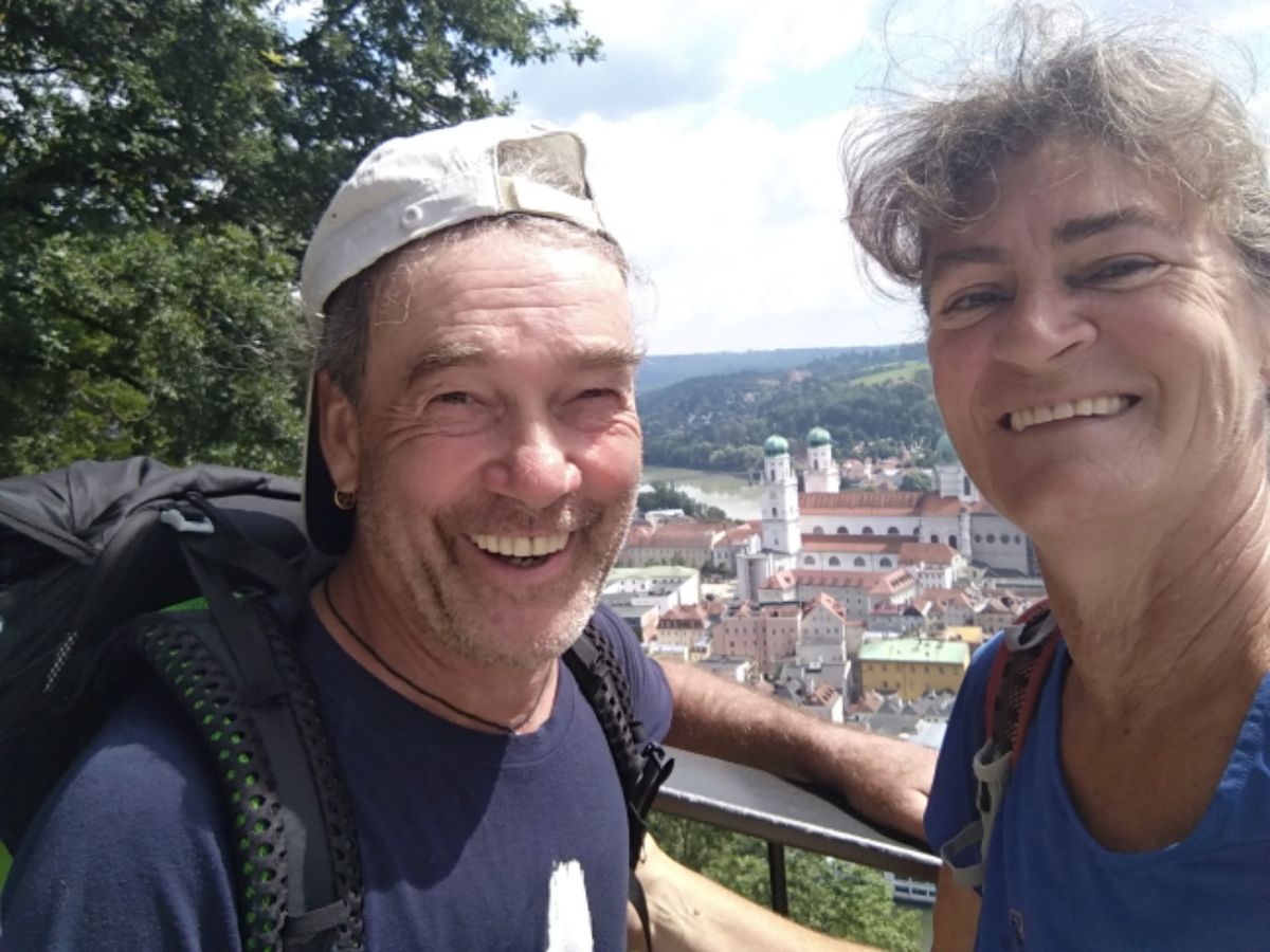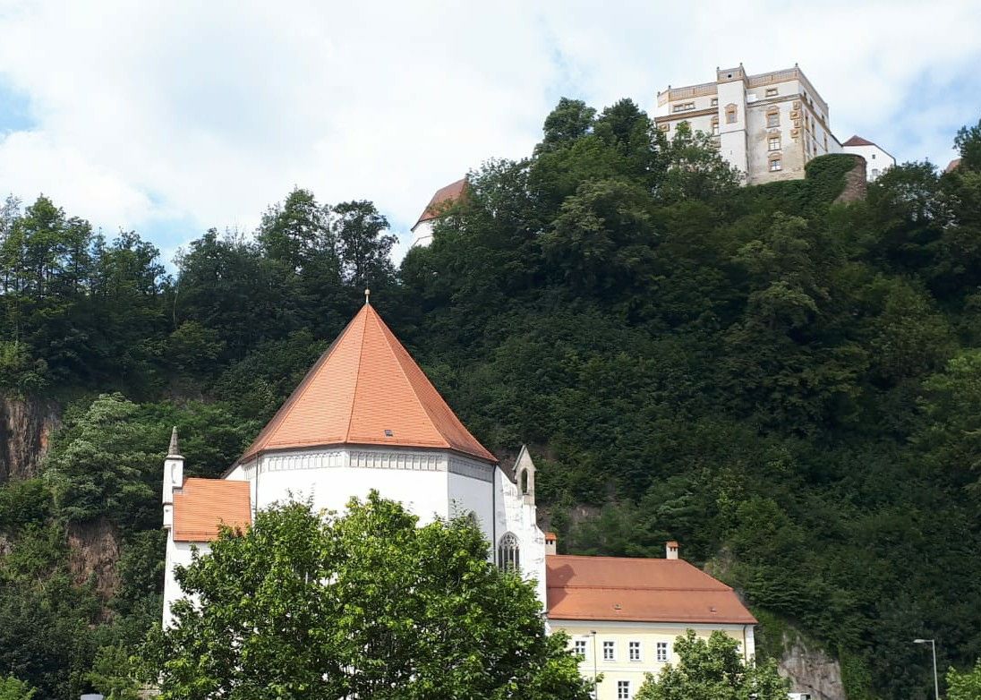 Wir haben beide schlecht geschlafen und sind früh wach. Reisefieber ? Oder ist es einfach das dumme Gefühl, dass unsere Wanderung zu Ende geht ? Wir sind nur noch knapp 2 Stunden von unserem Ziel entfernt. Anders als erwartet zeigt sich der Goldsteig bis zum Schluss von seiner besten Seite. Wir laufen eine sehr schöne Strecke und schleichen sozusagen durch die Hintertür hinein. Unser Weg führt um die Häuser-Bebauungen herum, auf schmalen Pfaden und durch Wald, grüne Hügel bis in die Stadt. Ein toller Abschluss oben an der Burg. Die Veste Oberhaus, eine Festung aus dem 13. Jahrhundert, thront oberhalb der Dreiflüsse-Stadt. Über den alten Wehrgang steigen wir hinunter zur Altstadt. Durch die Schießscharten sind von oben ganz deutlich die drei unterschiedlichen Farben der Flüsse zu erkennen. Im Dreiländereck öffnet sich die Landschaft zum weiten Blick über das Donautal und das Mühlviertel.