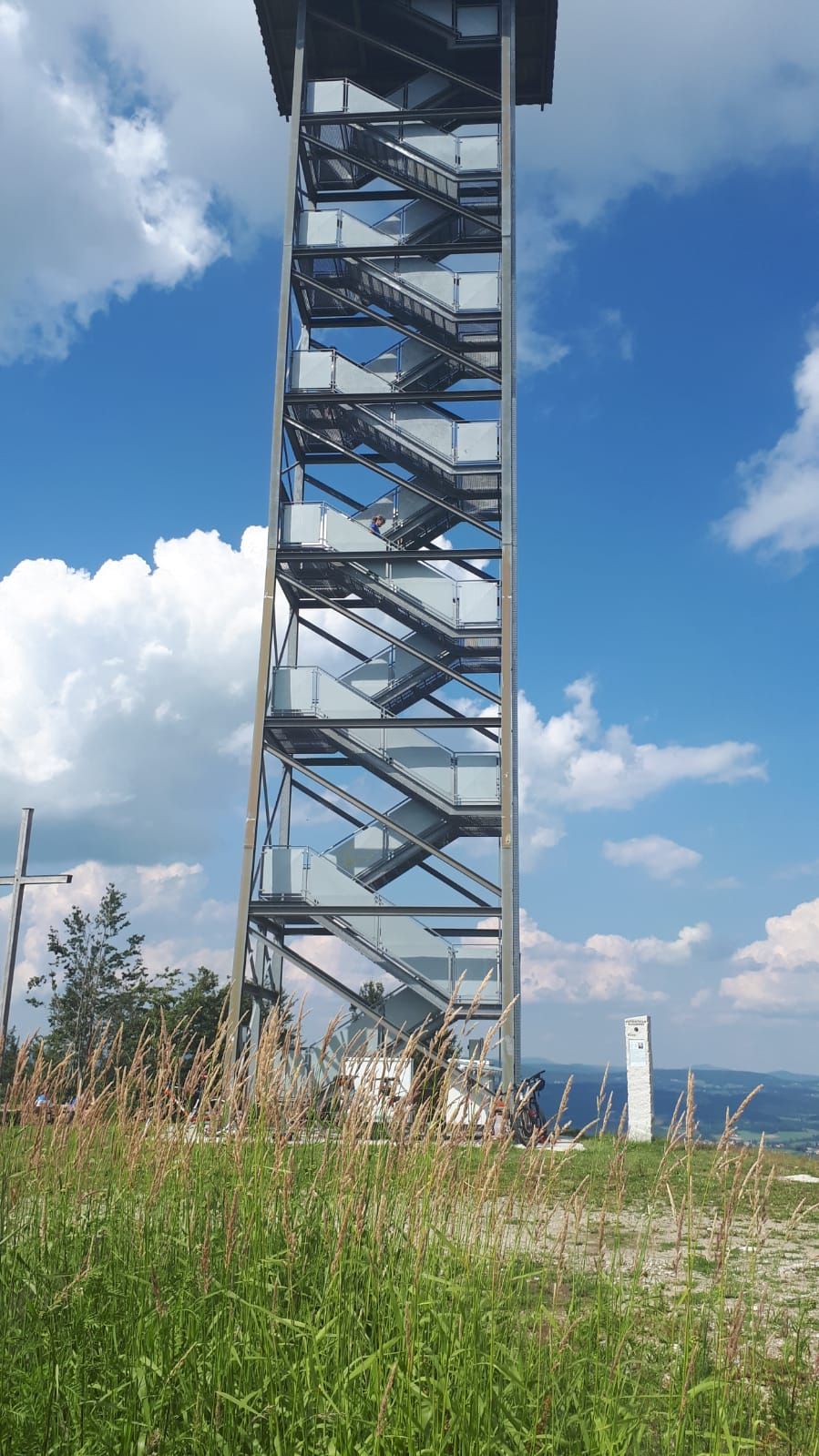 Der Goldsteig führt uns über die letzten Hügel. Am Wegesrand gibt es wieder süße Himbeeren zum Naschen. Thomas probiert Haselnüsse vom Strauch, die schmecken allerdings noch nicht besonders gut. Es geht hinauf zum Oberfrauenwald-Gipfel mit 950 Metern Höhe. Dort befindet sich das Nordische Zentrum mit seiner Skisprung-Schanzenanlage. Oben auf dem Plateau steht ganz unerwartet ein Turm. Der Aussichtsturm am Oberfrauenwald ist 27 Meter hoch und kann über eine stabile Metalltreppe bestiegen werden. Von der Aussichtsplattform aus haben wir einen schönen Rundum-Blick. Wir sehen noch einmal den Dreisessel-Berg und den Hochkamm, auf dem wir gestern mehrere Stunden gelaufen sind. Passau ist gar nicht mehr weit.