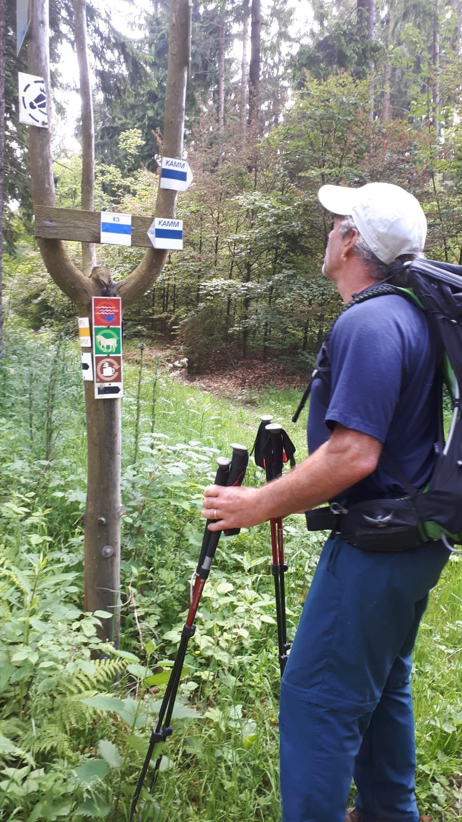 Am Montag, den 15. Juni, geht es endlich richtig los. Wir wandern an diesem ersten Tag von Geising bis nach Holzau. Am Nachmittag befinden wir uns ganz nahe der tschechischen Grenze, die gerade erst wieder für Deutsche geöffnet hat. Wir laufen mal eben hinüber nach Moldava und machen eine schöne Pause in einem für uns unbekannten Land. Früher Feierabend nach 26 Kilometern, denn mehr sollte man sich am Anfang nicht zumuten.