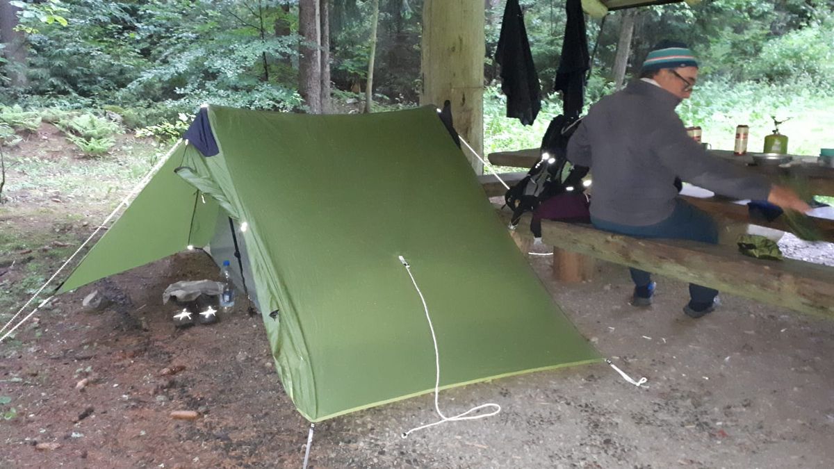 Nebel am Morgen, der sich nicht auflösen will. Es ist kühl. Da kommt ein steiler Anstieg genau richtig. Oben auf dem Gipfel steht ein zünftigen Wirtshaus, das kommt uns wie gerufen. In der Hirtsteinbaude gibt es zwar um 11.00 Uhr kein Frühstück mehr, aber dafür genehmigen wir uns ein verfrühtes Mittagessen. Der Nachmittag bringt uns immer stärker werdenden Regen, die neuen Ponchos kommen zum Einsatz. Bei Cerny Potok sind wir wieder sehr nahe an der Grenze und laufen für einen kleinen Einkauf beim Vietnamesen-Kiosk auf die andere Seite. Nach 30 Kilometern erreichen wir einen Picknick-Tisch, dessen weit überhängendes Dach uns guten Schutz bietet. Nicht erlaubt, aber egal, wir stellen das Zelt direkt neben den Bänken auf.