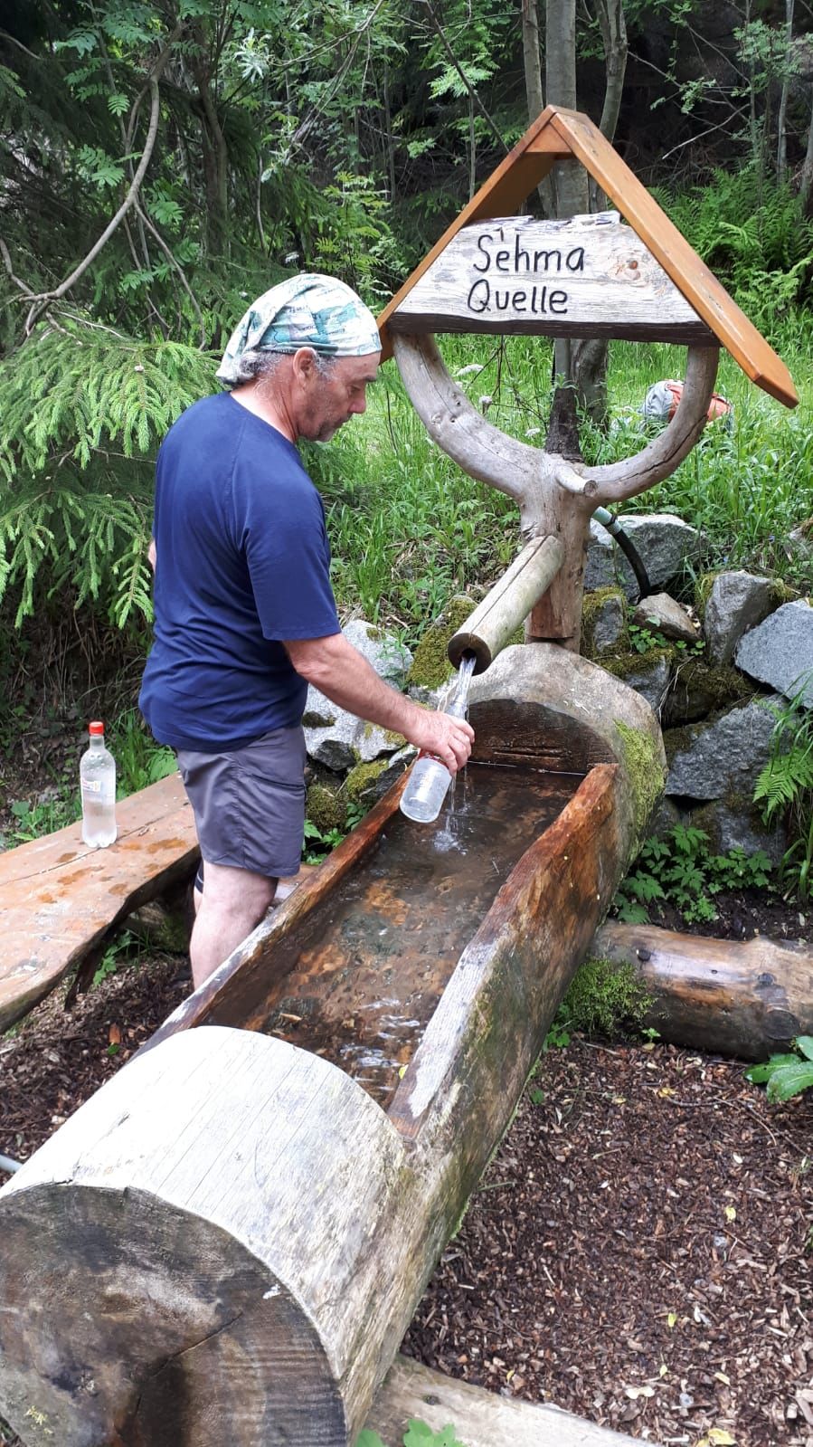 Was soll’s – wir hatten es nicht anders erwartet. Da kommt die Knie-Bandage zum Einsatz, und weiter geht’s. Am Wettinweg, ungefähr auf Kilometer 52, entdecken wir eine Quelle, die nicht in unserer Karte verzeichnet ist. Herrlich klares und erfrischendes Wasser wird immer gerne genommen.