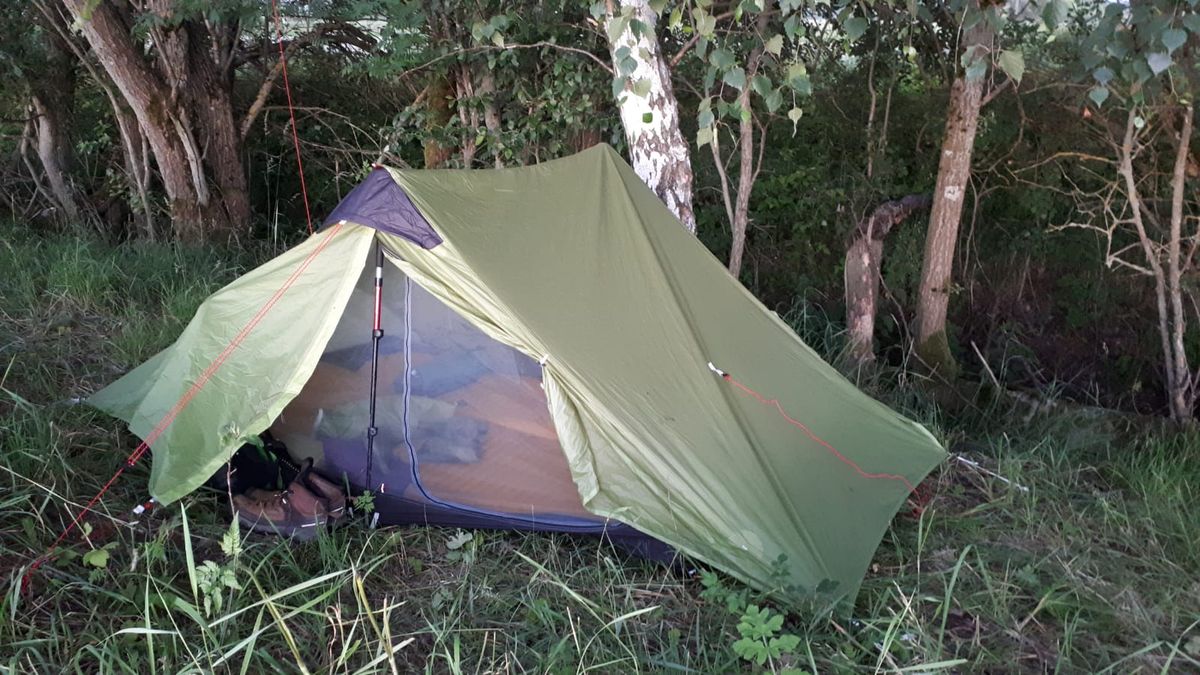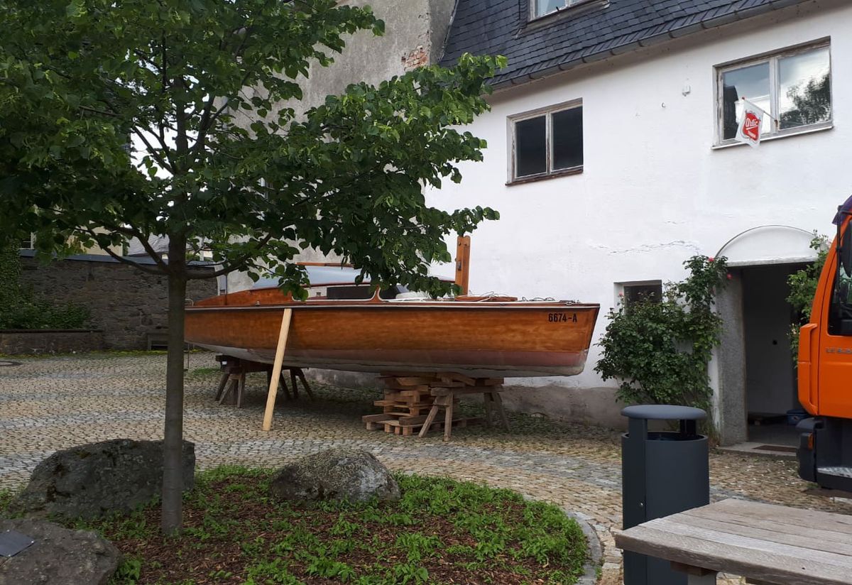 Mittwoch brauchen wir weitere 2 Stunden, um wieder auf den Original-Kamm-Weg zu stoßen. Der Proviant geht zur Neige, wir müssen unbedingt etwas einkaufen. Durchqueren mehrere Dörfer, aber es gibt keine Läden. Bäcker, Metzger, überall nur heruntergelassene Rolläden. Selbst die Gaststätten, an denen wir vorbeikommen, sind geschlossen. Gegen Mittag Pause ohne Essen, nur mit Wasser. Wir halten Kriegsrat. In zwei Stunden fährt ein Bus in die nächste größere Stadt. Sollen wir etwa so lange hier warten, hinfahren, dann im Ort einkaufen und wieder zurückfahren ? Wären erst nach 19.00 Uhr wieder da, wo wir jetzt sitzen. Nein, das ist uns zu viel Aufwand, wir marschieren einfach weiter. Es wird mühsam. Wir schleppen uns bis nach Krebes, einer Häuseransammlung auf 6 km² Fläche. Nie gehört, nicht erwähnenswert. 😉 Aber eine Eisfahne in einem Fenster weckt unsere Aufmerksamkeit. Gibt es hier etwa einen Kiosk oder Außer-Haus-Verkauf ? Erst einmal setzen wir uns auf den zentralen Platz vor dem Haus. Kurioserweise steht dort ein Boot, eine schöne Jolle aus Mahagoni-Holz. Sehr merkwürdig, hier so mitten im sächsischen Binnenland direkt vor der Haustür. Ich entdecke eine weitere Blase am großen Zeh. Autsch ! Wir fragen nach Wasser und bekommen unsere Flaschen gefüllt. Darauf folgt eine Haus-Führung. Wenig später wird uns Grüner Tee angeboten. Ja, sehr gerne. Und zur Krönung des Nachmittags wird Kuchen dazu gereicht. Wir sind begeistert. Das passt gut, wo wir doch fast nichts mehr zum Essen im Beutel haben. So kommt es, dass wir jetzt einen Kontakt aus Krebes in unserem Adressbuch haben. Stefan ist ein Künstler und Lebenskünstler, ein Alt-Hippie, der uns mit spannenden Geschichten aus seinem Leben unterhält. Interessante Gespräche und das Angebot, im Theatersaal seines riesigen Hauses zu übernachten bzw. jederzeit dort wohnen zu dürfen. Das ist Trail Magic, wie wir sie sonst nur aus den USA kennen. Danke ! Nach dieser Stärkung mit Tee und Kuchen fällt es uns leicht, noch eine weitere Etappe zu laufen. Kaum steht unser Zelt am Rande eines Feldes unter tiefhängenden Ästen, da fängt es an zu regnen.