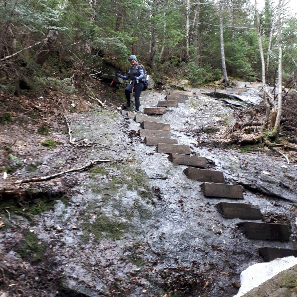 Auch unser nächster Wandertag bleibt nass, obwohl die Sonne scheint. Schmelzwasser und Regen haben den Wald in einen Morast verwandelt. Der Matsch macht es nicht einfacher. Wir turnen und balancieren um die tiefsten Tümpel herum. Gegen das uns von oben entgegenkommende Wasser auf dem Trail kann man nichts machen, die Schuhe sind komplett durchgeweicht. Unsere heutige Etappe bietet einige schöne Kletterpartien. Es geht über den Ore Hill und den Mount Mist, beide Hügel sind einfach zu bewältigen.