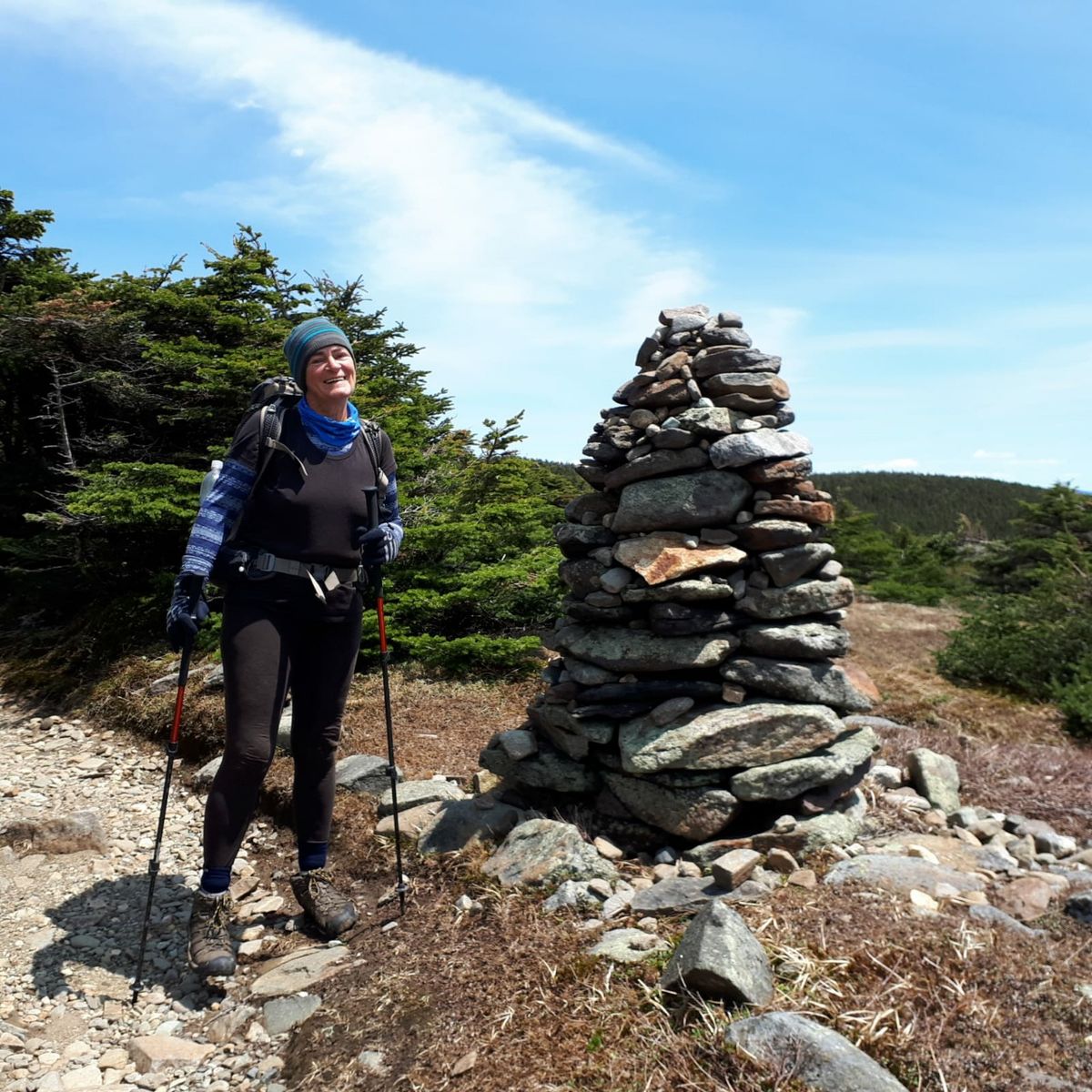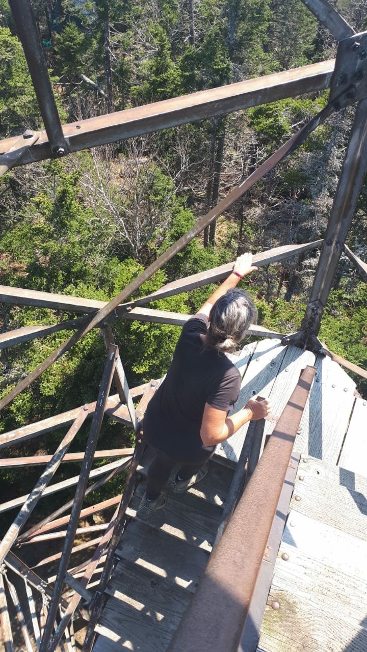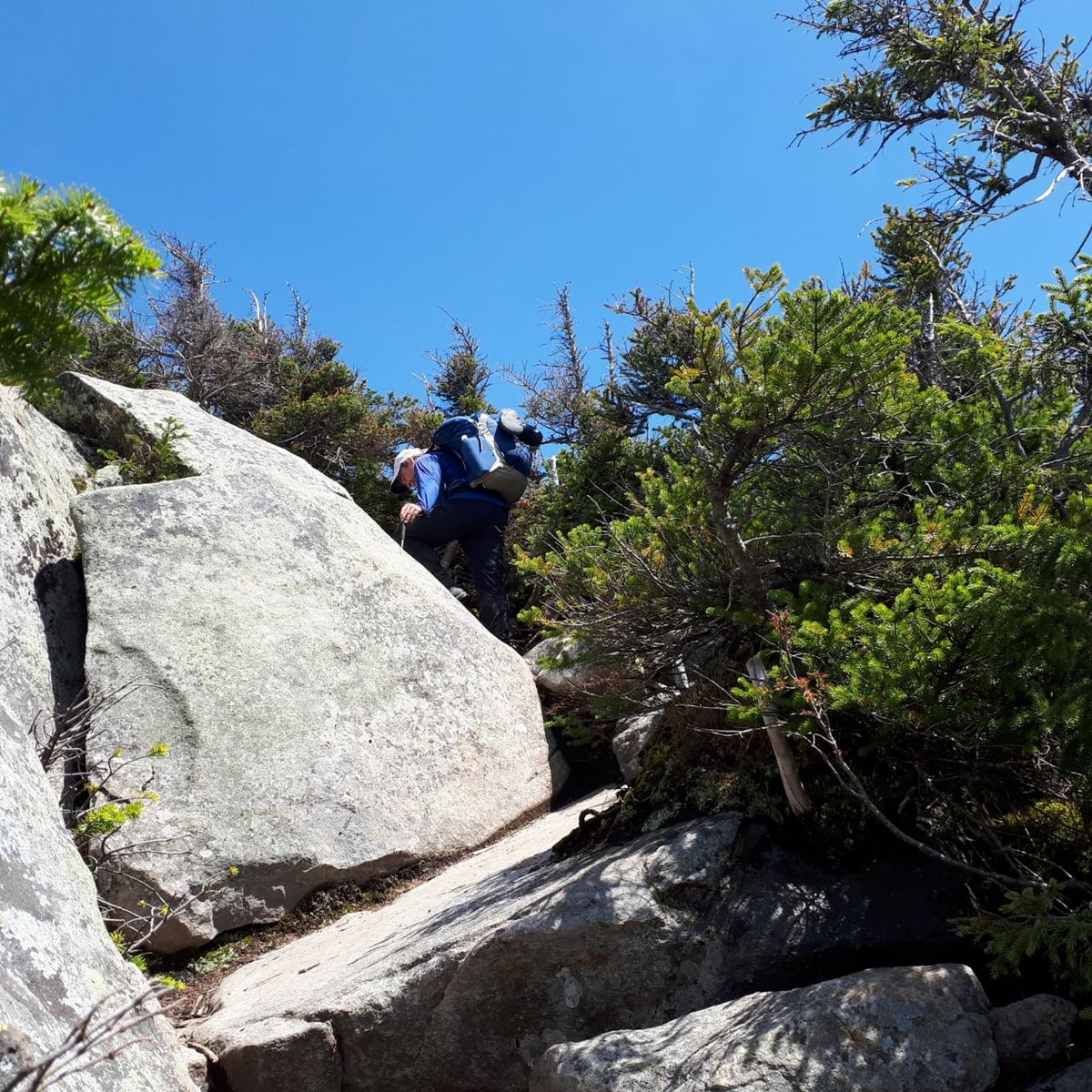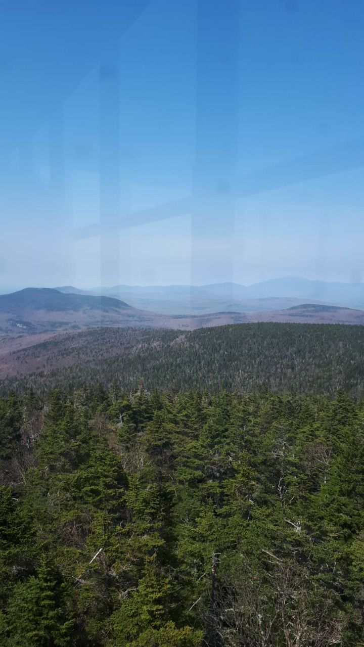 Eine knappe Stunde entfernt von unserem Nachtlager kommen wir an einem Seitenweg vorbei, der zum Haus von Bill Ackerly führt. Wir haben diesen Hiker-Freund, der immer Eis und kalte Getränke für vorbeikommende Wanderer bereithält, schon 2012 besucht. Zufällig hat er an jenem Tag seinen 85. Geburtstag gefeiert, er müsste also jetzt im 92. Lebensjahr sein. Wir überlegen kurz und sparen uns dann den Abstecher. Kurze Zeit später queren wir eine Straße und treffen dort auf einen Mann mit einem süßen Hundewelpen. Freundliches Grüßen, ein bisschen Smalltalk …. so sind die Amis eben. Der Hunde-Papa bestätigt uns, dass wir sehr früh dran sind in der Saison. Er geht jeden Morgen hier mit dem Puppy Gassi, aber hat in diesem Jahr noch keine AT-Hiker getroffen. Danach wird unser Weg deutlich schwieriger. Hilfestellung geben Holzleitern und Eisensprossen, die an besonders ausgesetzten Stellen angebracht sind. Immer öfter sehen wir Haufen von Elch-Kötteln. Viele, sehr viele …. Sind wir schon im Land der „Moose“ ? Eigentlich hatten wir Elche erst im Bundesstaat Maine erwartet, soweit wir uns erinnern können. Aber diese Hinterlassenschaften sprechen eine deutliche Sprache, da werden wir wahrscheinlich gerade von Elchen beobachtet. Kröten hüpfen unbeholfen über den Trail. Man muss aufpassen, dass man nicht drauf tritt. Um die Mittagszeit erreichen wir bei bestem Wetter den Gipfel des Smarts Mountain. Dort oben gibt es einen Feuerturm, den man über eine steile Treppe erklimmen kann. Offene Stufen, alles etwas wackelig und sehr viel Wind dort oben.