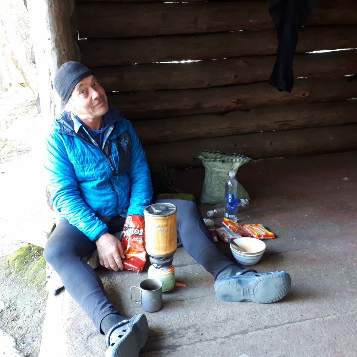 Wunderbar geschlafen, kein Schnarchen gehört. Nur eine kleine Maus hat in der Nacht ihr Unwesen getrieben. Das freche Tierchen ist putzmunter durch die Shelter getobt und hat unsere ausgebreiteten Sachen inspiziert. Ich meine sogar, dass ich einmal etwas in meinem Schlafsack gespürt habe, war aber zu müde, um das genauer zu untersuchen. Pech für die Maus, wir haben keinen Krümel übrig gelassen und den Proviantbeutel aufgehängt.
