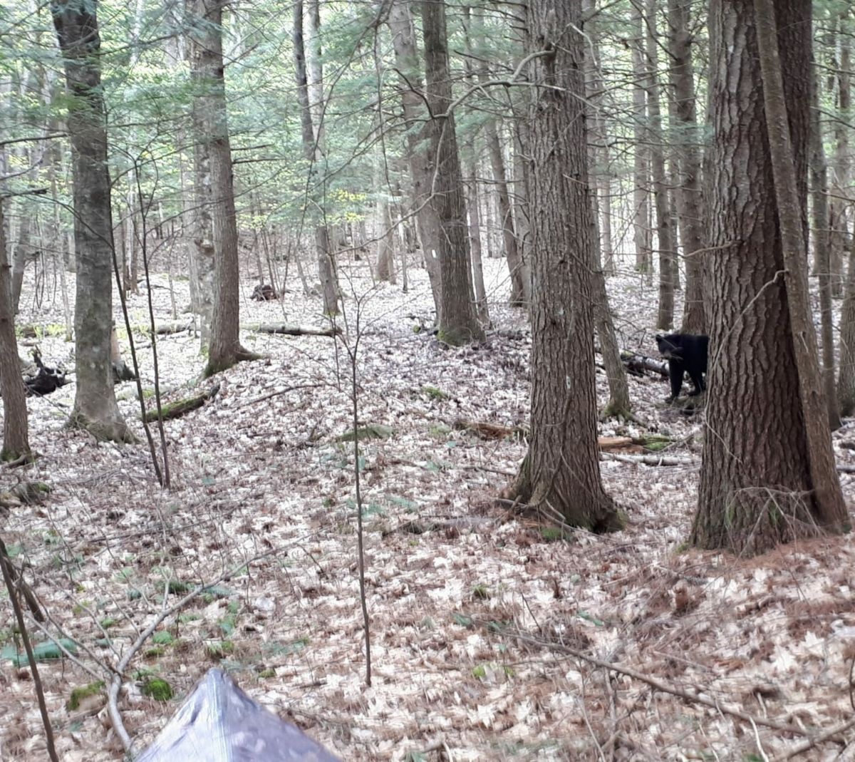 Gleich am ersten Morgen haben wir unsere erste Bären-Begegnung, so nahe, wie man sich das gar nicht wünscht. Wir haben beschlossen, auf dieser Etappe noch nicht so viele Meilen zu laufen, also spät zu starten. Während wir noch mit dem zweiten Kaffee im Schlafsack liegen, sehe ich einen Bären in etwa 5 Meter Entfernung vor dem Zelt stehen. Ein Schwarzbär, noch nicht ganz ausgewachsen, wir schätzen ihn auf zwei Jahre. Was tun ? Hoffen, dass er uns nicht bemerkt und von selber abhaut ? Fehlanzeige ! Spätestens beim Blickkontakt mit dem Bären wird klar, dass er uns sehr wohl gesehen hat und wir reagieren müssen. Thomas steht auf und versucht es zunächst mit lautem Schreien, dann mit der schrillen Bärenpfeife. Beides beeindruckt das Tier überhaupt nicht, dieser Bär scheint schwerhörig zu sein. Erst als ich ebenfalls nach draußen gehe und meinen Schlafsack in Richtung Bär ausschüttele, da weicht er ein paar Schritte zurück. Mir fallen die Stöcker ein, die ich hoch erhebe und mehrmals gegeneinander schlage. Das macht Eindruck. Der Bär ist nicht scheu, er hat gar keine Angst, aber er trollt sich langsam. Wir sind erleichtert, denn jetzt im Frühjahr ist die Winterruhe gerade vorbei. Die Bären sind hungrig, mit denen ist im Moment bestimmt nicht zu spaßen. Deswegen haben wir auch erst ein Foto gemacht, nachdem Meister Petz einige Meter zurückgewichen ist und wir uns sicher fühlten.