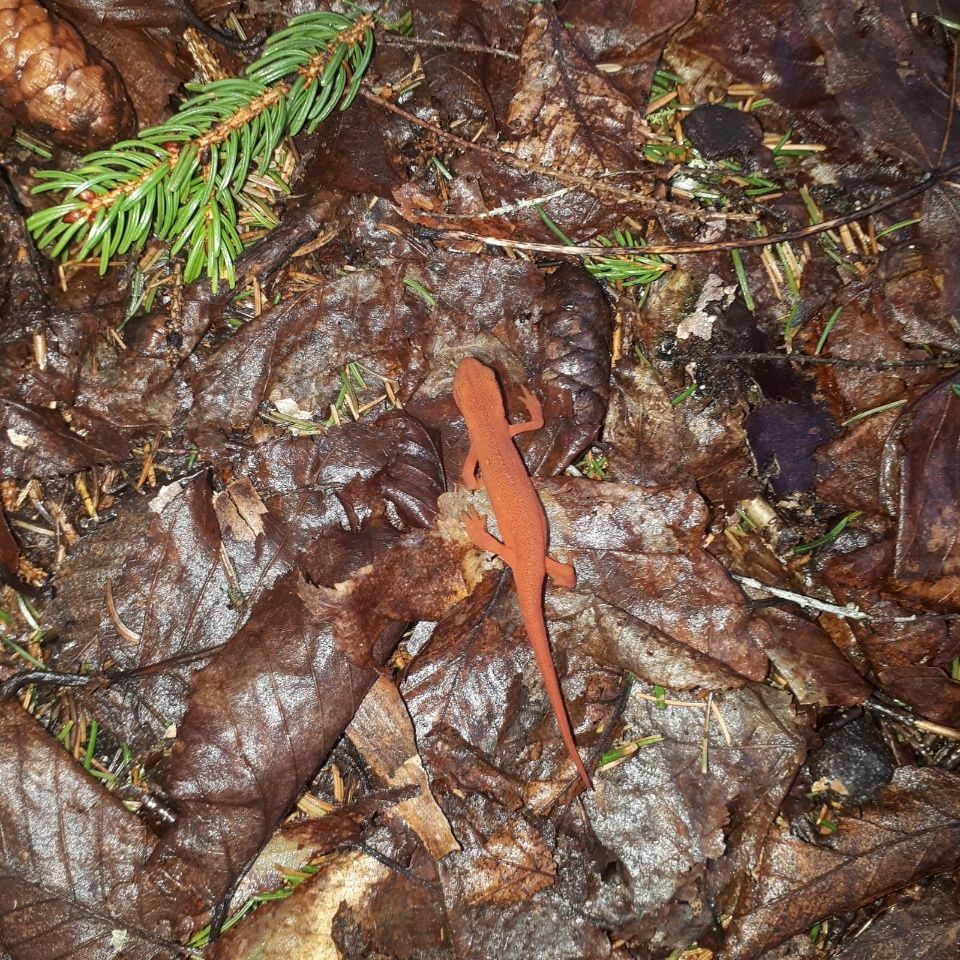 Der neue Tag beginnt mit einem Bach, der durch den Regen der letzten Nacht zum reißenden Strom angeschwollen ist. Damit haben wir nun wirklich nicht gerechnet. Normalerweise könnte man auf Trittsteinen oder Baumstämmen trockenen Fußes auf die andere Seite balancieren, aber heute ist alles komplett überspült. Wir suchen kurz in beiden Richtungen, ob es eine gute Stelle zum Überqueren gibt, aber es herrscht überall Hochwasser. Also ziehen wir unsere Wanderschuhe und langen Hosen aus, gehen barfuß in die Crocs und waten durch die kalte Strömung ans gegenüberliegende Ufer. An der tiefsten Stelle reicht es hoch bis zum Oberschenkel. Unter normalen Umständen hätten wir diesen Bach gar nicht zur Kenntnis genommen. Bei diesem erhöhten Wasserstand kostet uns die Geschichte etwa eine Stunde Zeit. Über den nächsten Wasserlauf können wir auf Holzbohlen balancieren. Die Stämme sind nass und sehen glatt aus. Ich traue mich erst nicht hinüber. Thomas geht vor. Naja, ich dann zögerlich hinterher. Muss ja ….. fliegen kann ich nicht. Die Bohlen sind rutschig und wackelig. Nicht schön, aber sehr langsam und konzentriert gelange auch ich schließlich auf die andere Seite. Der heftige Regen hat den Trail in einen Sumpf verwandelt. Das ist genau das richtige Klima zum Schlüpfen für Salamander. Die durchscheinend orange-roten Baby-Salamander krabbeln blind und unbeholfen durch den Matsch.