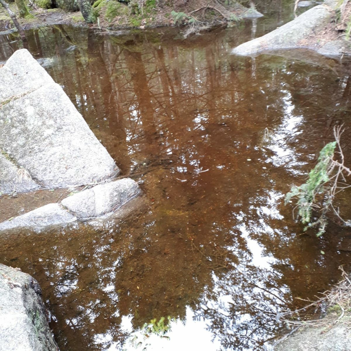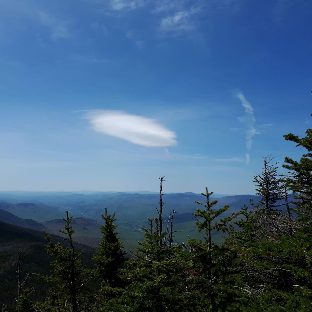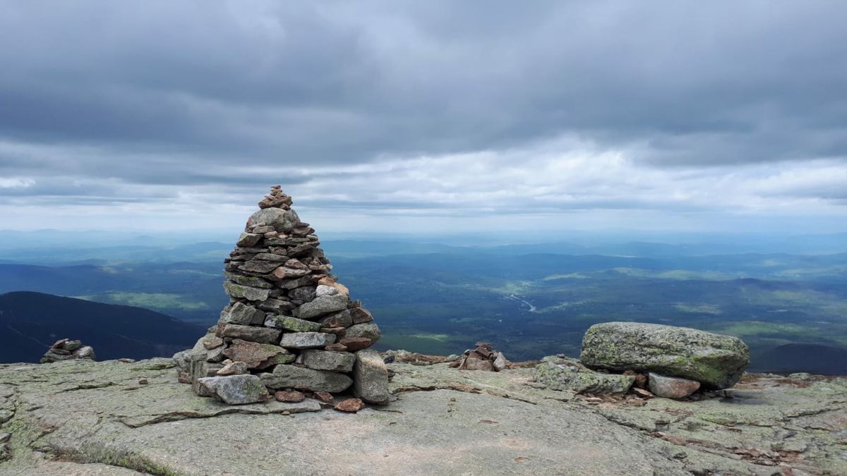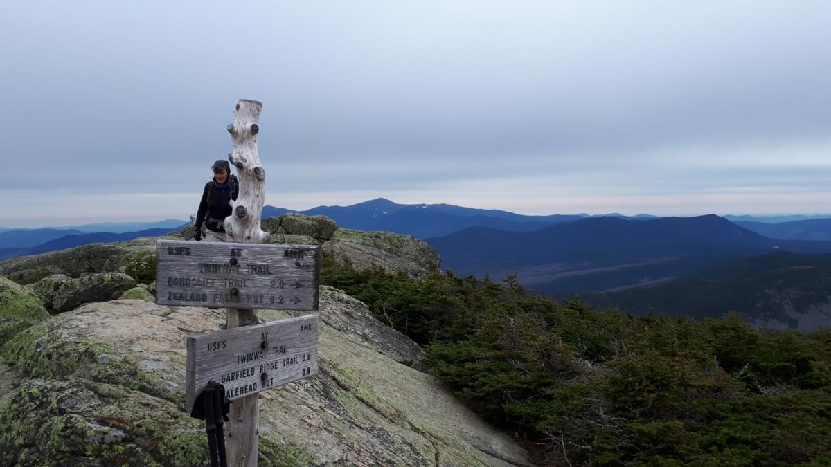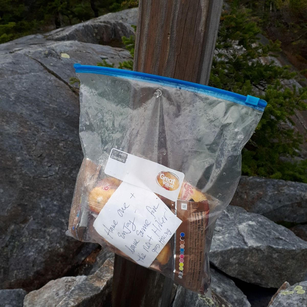Gleich am nächsten Morgen stehen wir vor einer unangenehmen Überraschung. Aus dem kleinen Bach, der ganz in der Nähe das Wasser für die Shelter liefert, ist durch den vielen Regen ein quirliger Fluss geworden. Gestern haben wir überhaupt nicht darüber nachgedacht, dass diese Wasserquelle morgens ein Hindernis darstellen könnte. Aber heute ist ein Überspringen auf den Trittsteinen trockenen Fußes unmöglich. Kaum sind wir losgelaufen, da müssen wir schon wieder anhalten und die Rucksäcke absetzen. Schuhe und Strümpfe aus, Hose hochkrempeln und ab durch die kühlen Fluten. Auf der anderen Seite nochmal stoppen, um die Füße abzutrocknen, danach die Socken und Wanderschuhe wieder anziehen. Das ganze ungeplante Manöver kostet uns eine Viertelstunde Zeit. Der Eliza Brook verfolgt uns den halben Vormittag. Der wilde Strom verläuft viele Kilometer neben uns auf der linken Seite. Manchmal stauen sich die Wassermassen aus Regen und Schneeschmelze, um in einem breiten Wasserfall über die Felsen nach unten zu stürzen. Schön anzusehen, aber eigentlich haben wir gar keinen Blick dafür. Wir möchten vorankommen. Ein stetiger Aufstieg bringt uns auf den Gipfel des South Kinsmann Mountain. Oben am Gipfelkreuz hängt eine Plastiktüte mit Geschenken für die Wanderer, die den Top erreichen. Es gibt süße Bisquit-Kuchen und Müsli-Riegel. Trail Magic ganz oben auf dem Berg – tolle Überraschung. Wir brauchen eigentlich nichts, denn wir haben auf halbem Wege gut gefrühstückt. Aber man freut sich doch über so eine nette Geste und nimmt natürlich etwas mit für später.