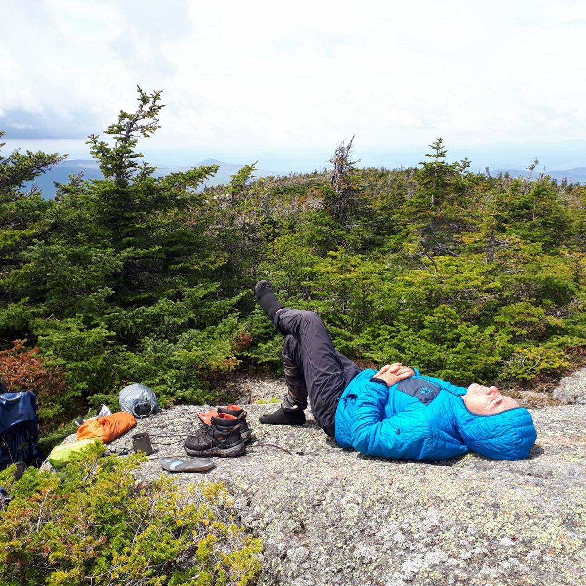 Eine anstrengende Kletterpartien über dicke Steine auf der einen Seite, dann auf der anderen Bergflanke genauso wieder herunter. Das ist eine mühsame Kraxelei, es geht viel langsamer voran als erwartet. Es zwickt in den Beinmuskeln, viel mehr geht nicht. Gute zwei Stunden später haben wir endlich Felsen und Geröll hinter uns gelassen. Sind jetzt etwa 700 Höhenmeter tiefer als der Mount Washington, so dass die Temperatur in der Nacht erträglich sein müsste. Wir sind froh, als das Gelände ebener wird und die ersten Büsche auftauchen. Ein kleines Nadel-Wäldchen liegt vor uns. Der erste halbwegs brauchbare Platz ist unser. Schaffen es gerade noch, beim letzten Tageslicht das Zelt aufzustellen. Passt nicht so gut. Etwas schief und krumm, an meiner Seite drücken ein Baum und ein Felsen hinein. Aber egal, wir sind nur noch müde. Morgen geht es in die Stadt. Wir brauchen einen off-day, um uns von der ersten Woche in den White Mountains zu erholen.