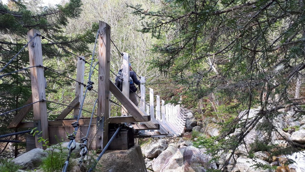 Letzter Tag im Wald, wir werden schon um 5.00 Uhr von munterem Vogelgezwitscher geweckt. Nur ca. 10 Kilometer trennen uns vom Visitor Center an der Pinkham Notch. Es geht durch relativ einfaches Gelände nur noch bergab. Zunächst etwas holperig über Steine und Wurzeln, dann wird der Pfad immer besser. Drei kleine Flüsse können wir trockenen Fußes überspringen. Der Peabody River auf halber Strecke präsentiert sich als wilder Strom, auf einer Hängebrücke gelangen wir schnell ans andere Ufer.