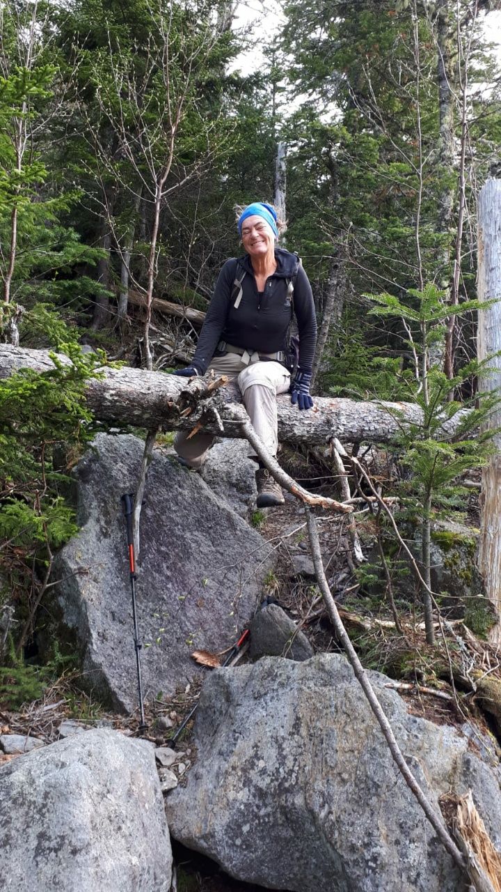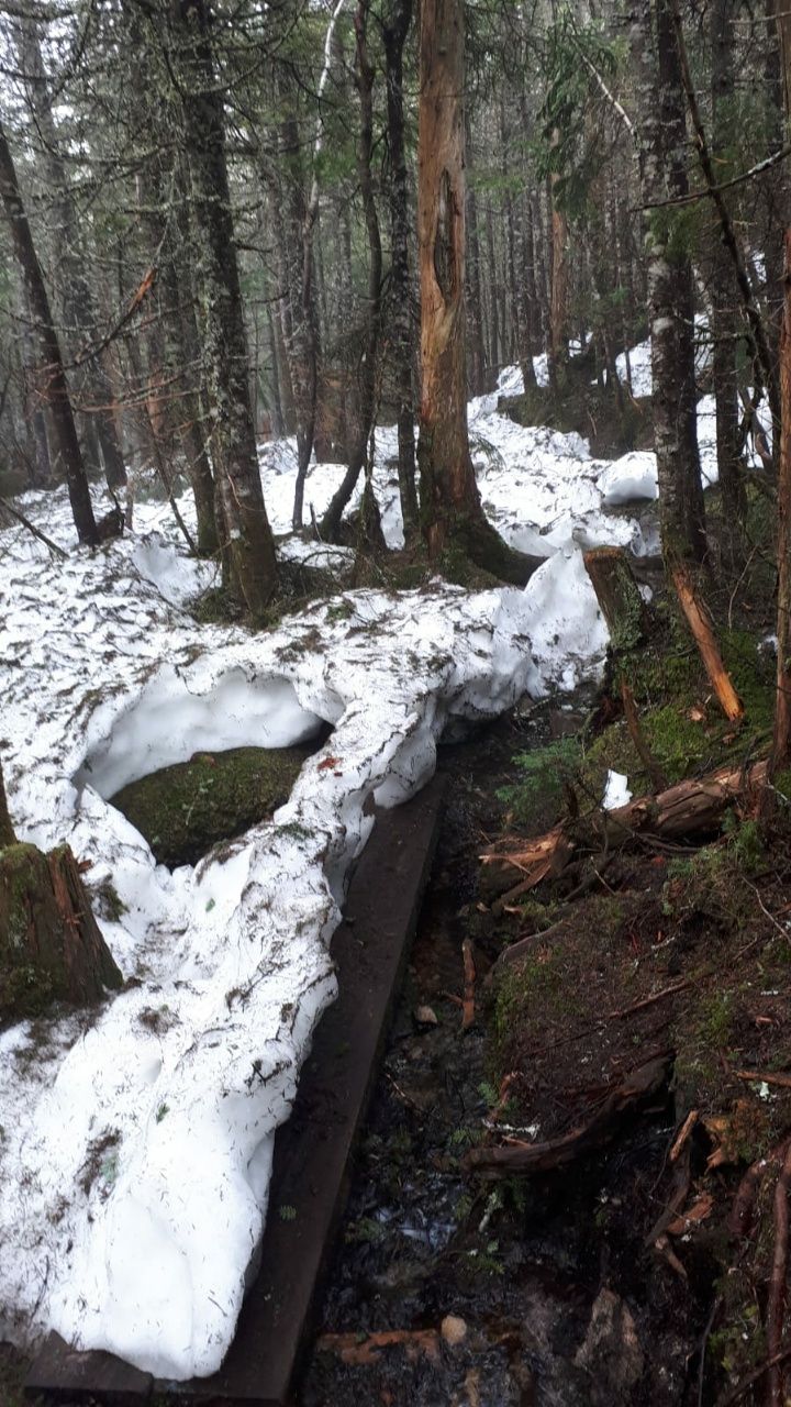 Wir haben herrliches Wetter beim Start in die White Mountains. Die Sonne lacht. Vor uns liegen zunächst 600 Höhenmeter Aufstieg zum Mount Wolf. Bereits nach einer Stunde stapfen wir schon wieder durch den Schnee. Hinunter wird der Wald immer wilder. Viele umgestürzte Bäume versperren den Weg, dazu eine Menge Kleinholz vom vergangenen Winter. Drüberklettern oder drumherum gehen, und dabei dürfen wir den ursprünglichen Trail nicht aus den Augen verlieren. Ich bleibe beim Übersteigen eines dicken Baumstammes an einem Ast hängen und hole mir einen langen Kratzer am Bein. Weiter unten wird aus Schnee Matsch. Der Weg ist verschwunden, nur noch Sumpf mit Wurzeln und Steinen durchsetzt. Die Schuhe und Strümpfe sind nass, aber das war ja zu erwarten.