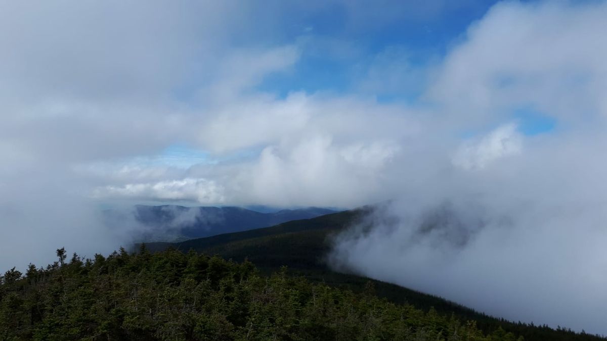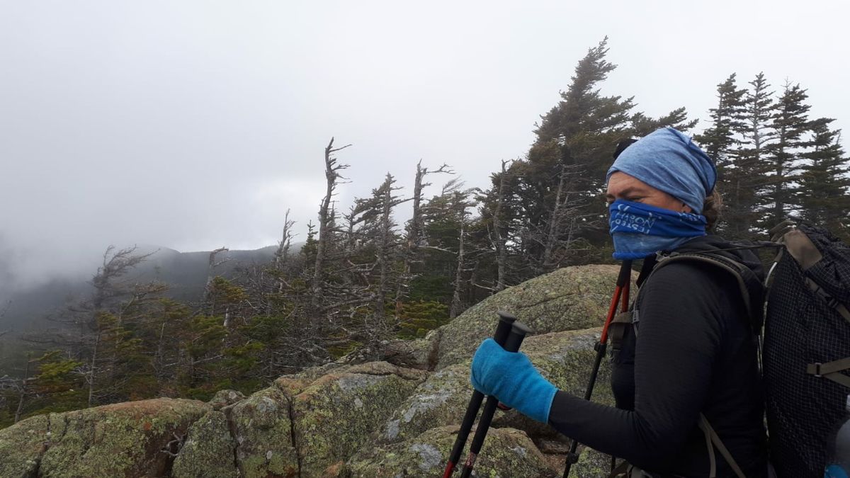 Schon nach einer halben Stunde bergauf tauchen wir ein in die grauen Wolken und kommen auch den ganzen Tag nicht mehr heraus. Schade, denn es liegt eine sehr schöne Etappe mit vielen Aussichtspunkten vor uns. Egal, in welche Richtung der Ausblick zeigt, man sieht einfach nichts. Das ist aber für uns völlig in Ordnung, weil wir genau dieses Stück damals bei Sonne und blauem Himmel erlebt haben. Wir sind froh, dass es nicht regnet. Kein Wind, daher erscheint es uns relativ mild. Zudem haben wir bisher ALLE hohen Gipfel in schön und trocken erlebt, so ein Glück hatten wir 2012 nicht. Da kann man also nicht meckern. Wir sind froh, dass wir nicht abgebrochen haben und genießen eine lange Pause im Nebel auf den Webster Cliffs. Stundenlang klettern wir über diese hellen Klippen mit ihren dicken Felsen. Diese Etappe macht richtig Spaß.