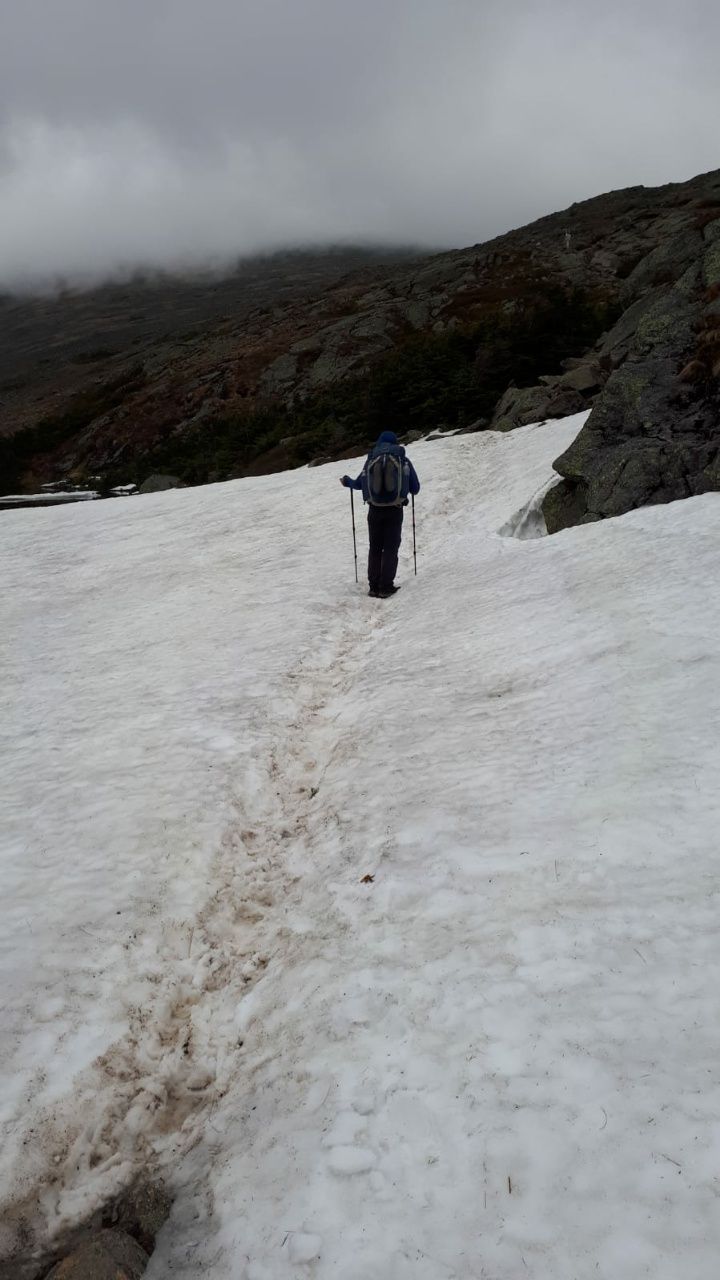 Ein paar Regentropfen fallen. Kurz nach diesem letzten Gipfel für heute liegt die Garfield Ridge Shelter. Dunkel und eng ist es dort. Zwei Männer haben bereits die besten Plätze außen belegt und ihr Nachtlager eingerichtet. Wir hauen wieder ab, da gefällt es uns nicht. Es sind nur 3,5 Kilometer bis zur nächsten Hütte, das schaffen wir sicher vor der Dunkelheit. Allerdings bietet das Gelände noch einmal Alles an Gemeinheiten, was man sich vorstellen kann. Zunächst müssen wir beinahe senkrecht durch einen Bach absteigen, dann gibt es Sumpf und schließlich wieder Schnee. Da liegen auf dem Trail mal eben 1,5 Meter hohe Schneewälle, die aber jetzt zum Abend hin gut tragen. Es heißt ja auch Frost Trail, wo wir gerade laufen. Der Name passt genau. Erst spät erreichen wir die Galehead Hut und fragen, ob wir dort übernachten dürfen. Der AMC unterhält insgesamt 8 Hütten unterschiedlicher Größe in den White Mountains. Die Übernachtungen inklusive Vollpension werden nur von gutbetuchten Gästen gebucht, weil sie sehr teuer sind. Allerdings hat sich der AMC eine gute Alternative ausgedacht, mit der auch nicht so zahlungskräftige Wanderer die Chance auf ein Dach über dem Kopf haben. Für AT-Hiker gibt es das Modell „work for stay“ – man hilft in der Hütte mit und bekommt dafür kostenlos Essen und einen Schlafplatz auf dem Boden. Offiziell sind die Hütten gerade wegen Grundreinigung für 3 Tage geschlossen, bevor die neue Saison losgeht. Eingelassen werden wir natürlich trotzdem. Da sitzen 5 junge Mädels, die ab morgen saubermachen werden. Heute gibt es noch nichts zu tun, also keine Arbeit für uns. Essen gibt es auch nicht, weil ja eigentlich gar nicht für Gäste geöffnet ist. Aber wir werden herzlich willkommen geheißen und dürfen uns eine Ecke auf dem Boden einrichten. Heißes Wasser gibt es zum Kochen und für Tee, wir können ganz zivilisiert am Tisch sitzen. Zwei Männer waren schon vor uns da und bleiben ebenfalls. Aber die trinken Whisky, kiffen und sind laut, auch als wir schon im Schlafsack liegen. Später geht das dann in Schnarchen über. Nicht schön, aber dafür bleiben wir diese Nacht warm und trocken.