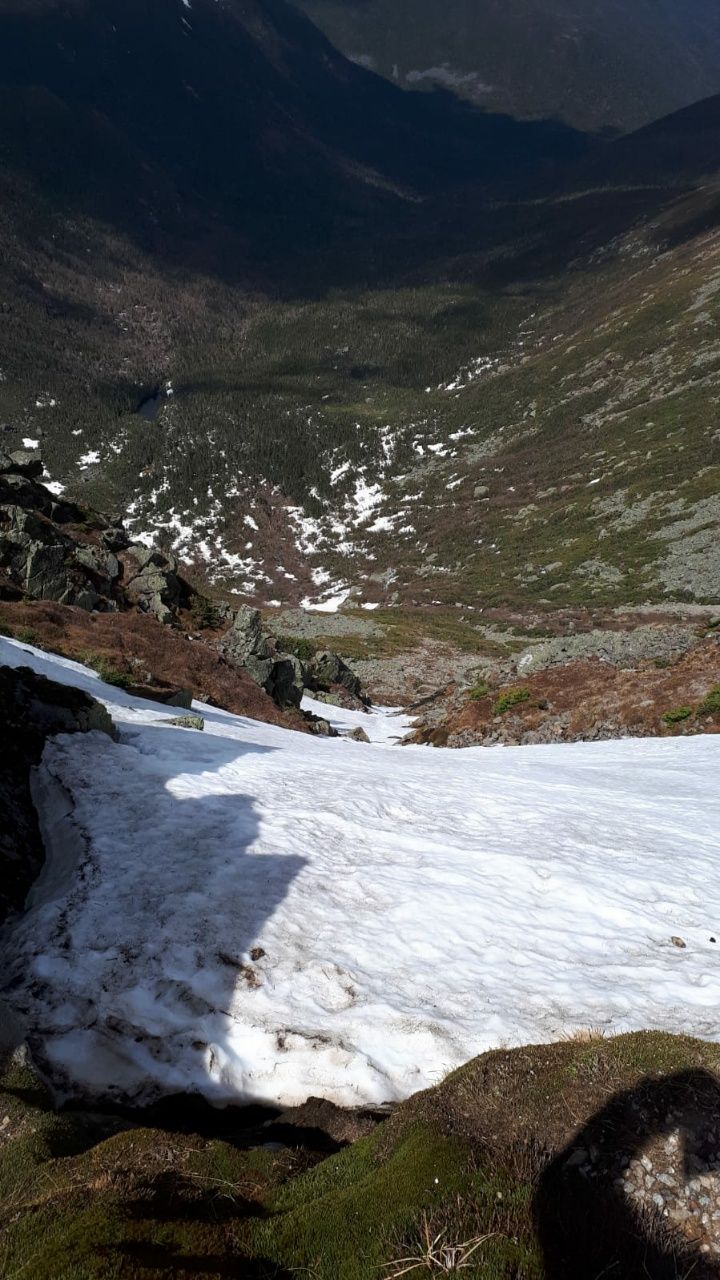 Das Wetter hier oben ist sehr dynamisch. Es kommt und geht so schnell, das kann man eigentlich gar nicht zwei Tage im Voraus planen. Umso mehr freuen wir uns. Alles richtig gemacht. Wir erleben einen wunderbaren Nachmittag mit vielen Wolkenlücken, blauem Himmel und Sonnenschein. Zwei ausgedehnte Schneefelder an den Flanken müssen überquert werden, aber durch die Mittagssonne ist der Schnee schön griffig geworden. Vorsichtig setzen wir Schritt für Schritt hintereinander und folgen der schmalen Spur am Berghang. Nicht besonders schwierig, aber es erinnert stark an unsere Schnee-Passagen auf dem CDT. Und man darf nicht nach rechts blicken, denn dort fällt der Abhang steil nach unten ab. Ohne Netz und doppelten Boden, ohne Bäume, die einen auffangen, würde man hier bei einem Sturz gefährlich weit nach unten abschmieren.