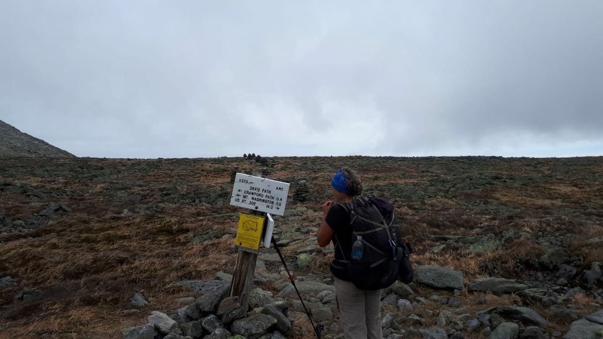 Früh wach, weil der Rummel in der Hütte losgeht. Um 7.00 Uhr gibt es über Funk den neuesten Wetterbericht für die White Mountains. Eine Kaltfront ist angesagt. Brrrr ! Dazu vereinzelte Schauer, damit können wir leben. Wir starten bereits um 7.45 Uhr mit Daunenjacken und frösteln in der Winter-Luft. Aber das dauert nicht lange, denn es geht sofort steil bergauf. Schon nach einer halben Stunde können wir mehrere Schichten Kleidung ausziehen. Der erste Gipfel vor uns ist der South Twin Mountain mit knapp 5000 Fuß. Kurz oben einen Blick in die Runde werfen, dann steigen wir genauso steil wieder ab.