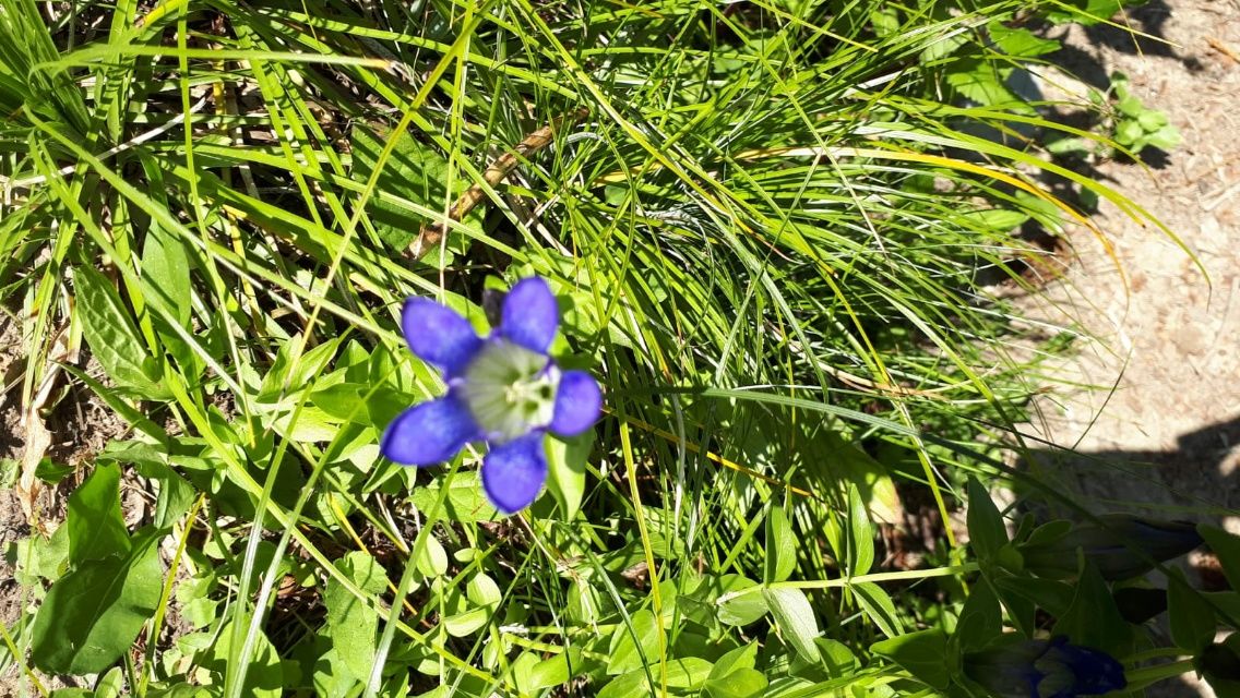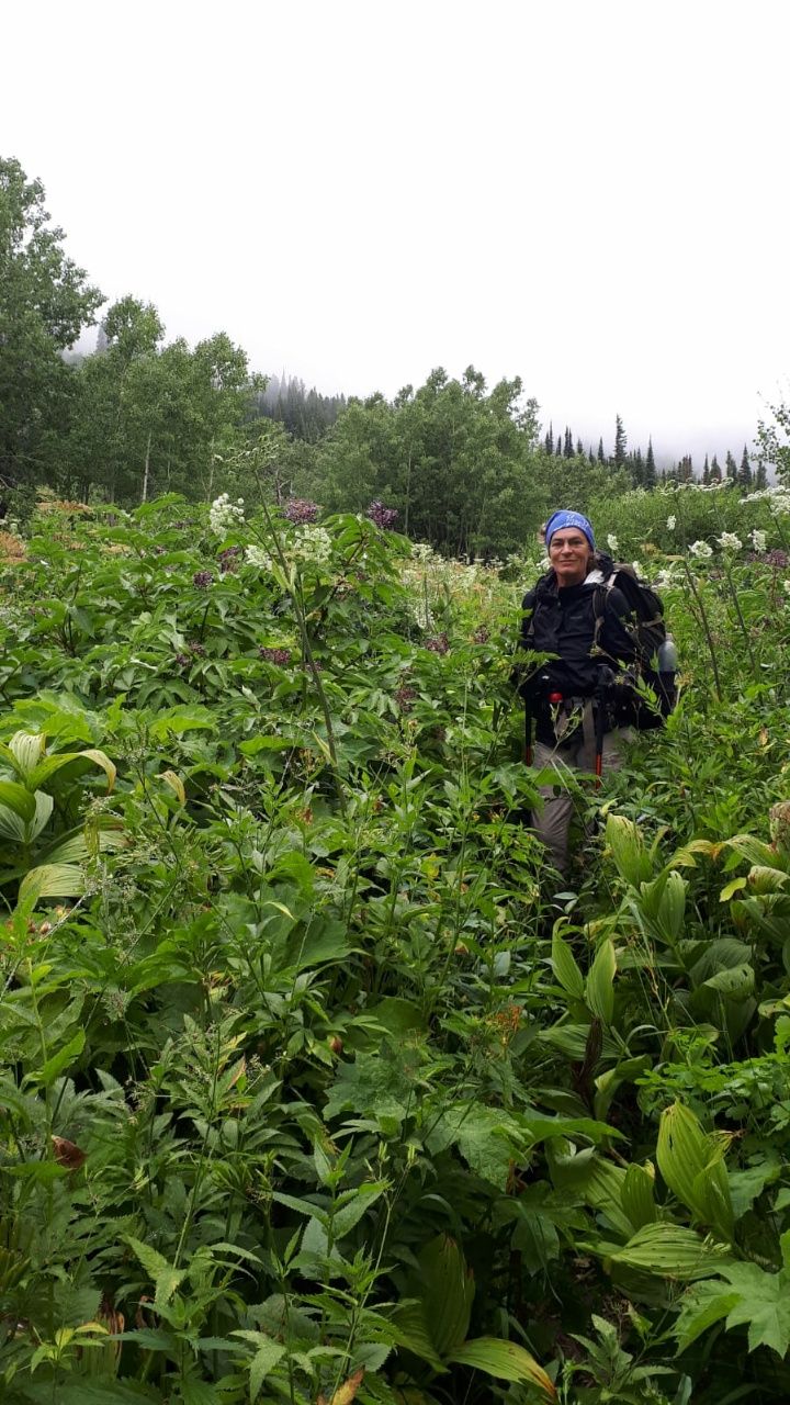 Sofort befinden wir uns auf einer ganz schmalen Spur in einer total wilden Landschaft. Links von uns fließt der Spotted Bear River in einer Schlucht. Wir laufen oberhalb auf einem schmalen Pfad am Hang entlang. Alles ist zugewuchert, dichtes Gestrüpp, hohes Unkraut, alles in saftigem Grün. Heidelbeeren wachsen hier ohne Ende. Es sind Unmengen, alle gleichzeitig reif, dunkel und prall. Wenn man einmal damit anfängt, dann kann man schlecht aufhören, so gut ist diese unerwartete Zwischenmahlzeit. Wir bleiben andauernd stehen, um die leckeren Früchte zu pflücken. So kommt man natürlich nicht besonders schnell vorwärts. Mittags um 12.00 Uhr haben wir erst 10 Kilometer zurückgelegt. Da müssen wir jetzt Gas geben. Schwarze Johannisbeeren wachsen auch am Weg, aber die sind nicht so schmackhaft wie die gezüchteten, eher etwas bitter. Himbeersträucher gibt es ebenfalls, aber die sind noch nicht reif. Sonst würden wir heute gar nichts schaffen …. oder Bauchschmerzen bekommen. Wir haben eine neue Blumen-Art entdeckt, die sehr auffällig ist wegen ihrer tiefblauen Farbe. Besonders hübsch ist es, wenn man von oben in die total symmetrisch angeordneten Blütenkelche schaut. Und diese Farbe – so ein intensives Blau gibt es selten in der Natur. Interessant ist auch, dass die Blütenkelche sich sofort verschließen, sobald die Sonne einen Moment verschwindet. Sonne wieder da, die Blütenkelche öffnen sich sofort und zeigen erneut ihre Farbenpracht.
