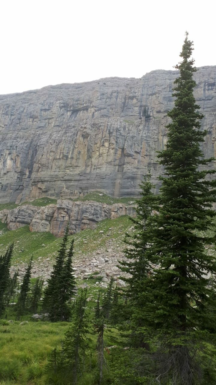 Thomas findet ein paar Wald-Erdbeeren. Die sind winzig klein und hellrot, also eigentlich noch gar nicht ganz reif, aber sehr aromatisch. Schade, dass es nicht mehr davon am Wegesrand gibt. Zum Frühstück gibt es eine Überraschung : Thomas hat zwei Dosen Sardinen in Olivenöl geschleppt. Die lassen wir uns mit den letzten Scheiben Brot gut schmecken. Ab morgen gibt es dann wieder Haferflocken. 😉 Mehrmals laufen wir durch oder über Bäche mit unglaublich klarem Wasser. Auch das, was von der Seite aus den Bergen fließt, ist sauber und eiskalt. Wir können an jeder Ecke trinken, ohne dass wir das Wasser behandeln müssen. Eine Gruppe uns entgegenkommender Tages-Wanderer bringt Neuigkeiten bezüglich der Feuersituation. Ein Ranger soll erzählt haben, dass es 50 Meilen nord-westlich von hier brennt. Das ist weit weg, da kommen wir nicht hin. Außerdem liegt der Brandherd demnach auf der anderen Seite der Chinese Wall, also keine unmittelbare Gefahr für uns. Schweißtreibender Aufstieg in der Mittagshitze, vor uns liegen 800 Höhenmeter bis zum Pass. Wir laufen den Wall Trail, der frontal auf die steile Felswand zuläuft. Da fühlt man sich auf dem schmalen Trampelpfad ganz klein und unwichtig. Sehr beeindruckend sind die verschiedenfarbigen Bänder im Gestein, dazwischen schmale Terrassen mit grünem Bewuchs.