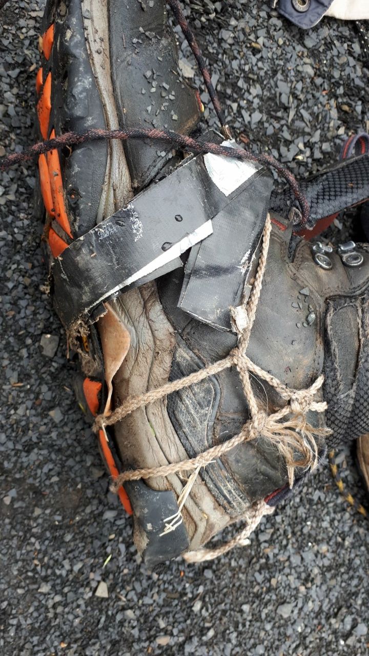 Unsere Sachen fallen nach knapp 3 Monaten alle auseinander. Thomas hat heute doppeltes Pech. Beim Absetzen des Rucksacks in der ersten Pause bleibt er hängen und reißt einen riesigen Winkelhaken in sein Hiker-Shirt. Das Loch ist so groß, dass er die rechte Schulter mit Sonnenschutz eincremen muss. Etwas später löst sich die Sohle vom rechten Schuh. Zum Glück haben wir letztens erst eine neue Rolle Tape gekauft. Damit wird die Sohle provisorisch angeklebt und das Ganze dann mehrfach umwickelt. Kann man 150 Kilometer in 5 Tagen mit Schuhen laufen, die nur noch von Klebeband zusammengehalten werden ?