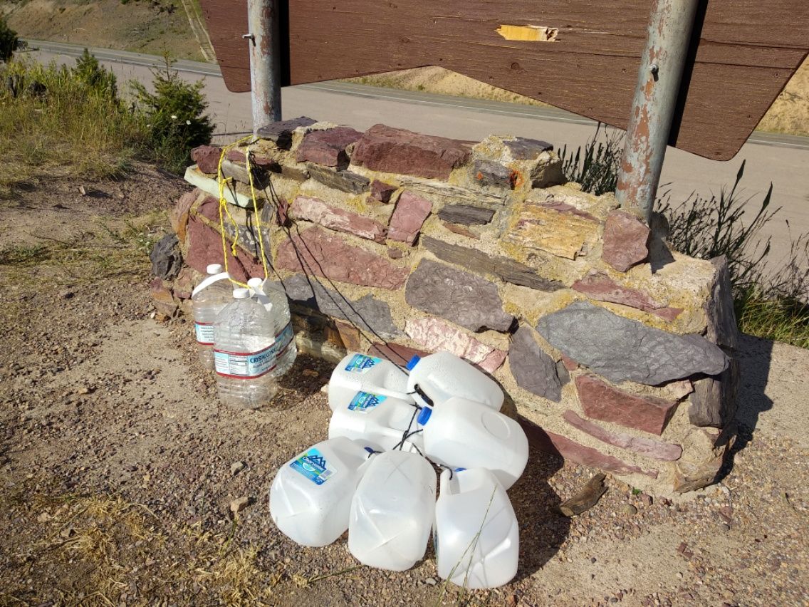 Trail Magic Wasser am Stemple Pass. Hier haben nette Menschen ein Wasser-Depot für die durstigen Wanderer eingerichtet. Das ist eine riesengroße Hilfe auf diesen trockenen Passagen. Drei Schotterstraßen und der CDT kreuzen am Stemple Pass. Im Winter ist es ein beliebtes Ski-Gebiet, jetzt nutzen nur die CDT-Hiker diesen tollen Pausenplatz. Es gibt eine Kompost-Toilette, mehrere Picknick-Tische, Grill-Möglichkeiten und sogar eine Mülltonne. Wenn man zur richtigen Tageszeit ankommen würde, dann wäre das eine ideale Stelle zum Übernachten.