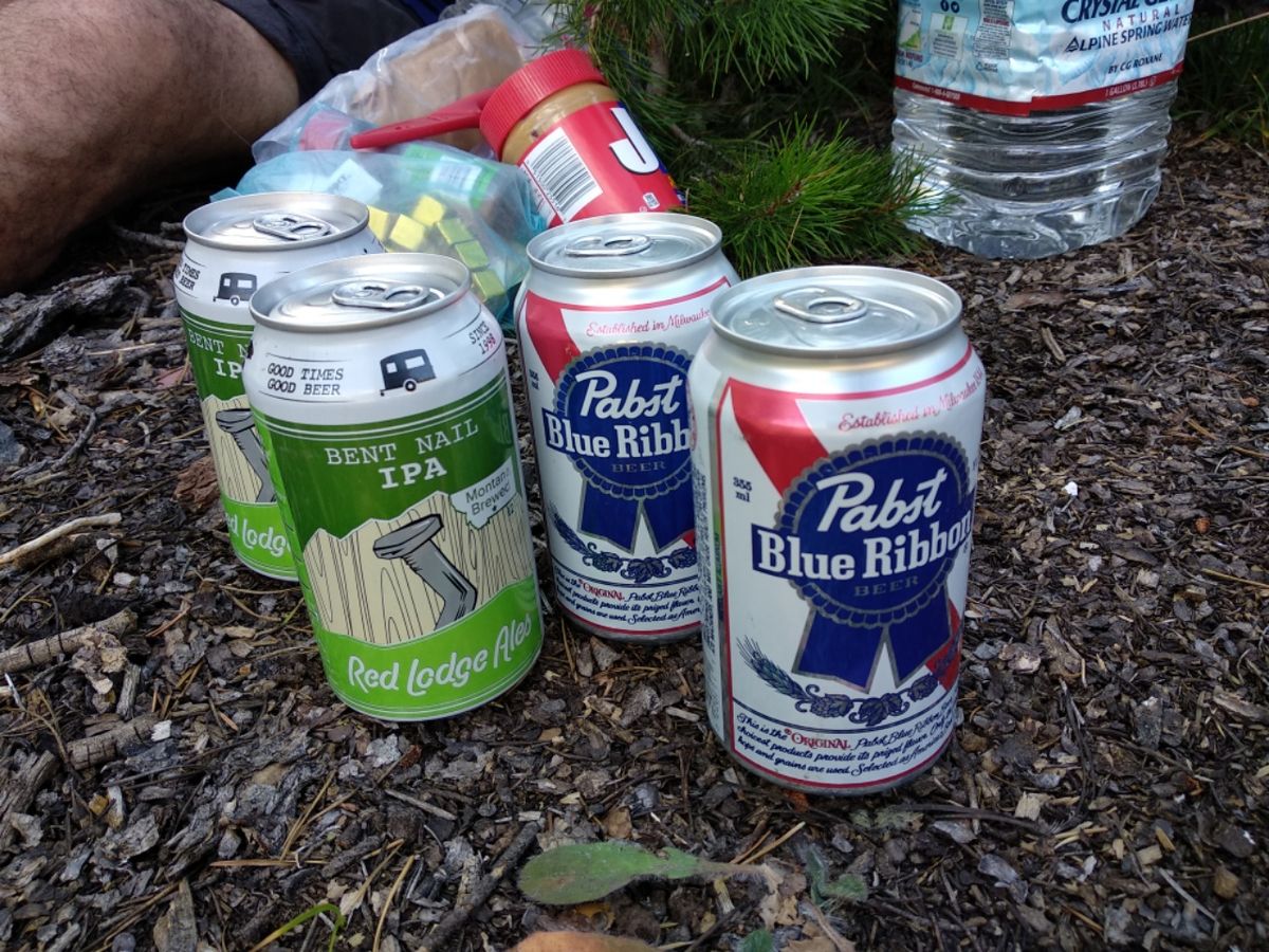 Es gibt Nudeln mit Erdnussbutter. Was sonst ? 😉 Ein Auto hält auf dem Parkplatz bei den Wasserbehältern. Zuerst denken wir, das ist der edle Spender. Der Mann steigt aus und gibt sich als Mountain-Biker zu erkennen, der sich die Route hier ansehen möchte, bevor er sie mit dem Rad fährt. Wir unterhalten uns eine Weile, dann kommt die alles entscheidende Frage : „Möchtet ihr ein Bier ?“ So ein Angebot können wir natürlich nicht ablehnen. Der Typ geht kurz an seinen Kofferraum und kehrt mit 4 Dosen Bier aus der Kühlbox zurück. Obercool ! 🙂 Wasser ist lebenswichtig, aber ein überraschendes Bier wird auch gerne genommen. Eine Dose trinken wir direkt zum Essen. Bent Nale, das ist ein in Montana gebrautes Bier, etwas stärker, für mich schmeckt es irgendwie aromatisiert. Es haut uns sofort in den Kopf. Jeder nimmt eine Dose PBR mit für später. Pabst Blue Ribbon ist ein ganz normales Lager-Bier, welches wir eigentlich immer kaufen. Gut und günstig.