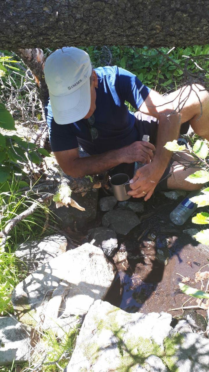 Zwei Gabelungen ohne jeden Hinweis, erst an der dritten Kreuzung finden wir ein Zeichen. Endlich sind wir wieder auf dem CDT, immer noch im Helena National Forest. Anfangs ist der Weg sehr holperig. Die Gegend ist voll mit umgestürzten Bäumen, die oft quer über unserem Pfad liegen. Also ist Klettern, Springen oder Umgehen angesagt, das geht natürlich nicht besonders schnell. Richtig wild ist es hier, unberührte Natur, die noch nicht aufgeräumt wurde. Die gesunden Bäume sind mit hellgrünem Moos bewachsen. Wir suchen und finden eine ganz tolle Wasserquelle. Thomas hat es ein bisschen unbequem, weil er sich durch dichtes Gebüsch bis an das Rinnsal herantasten muss und dann mit der Tasse sehr vorsichtig immer nur kleine Mengen schöpfen kann. Dafür ist das kühle Nass herrlich sauber und erfrischend.