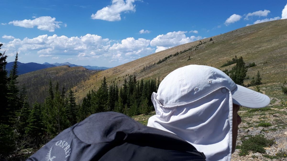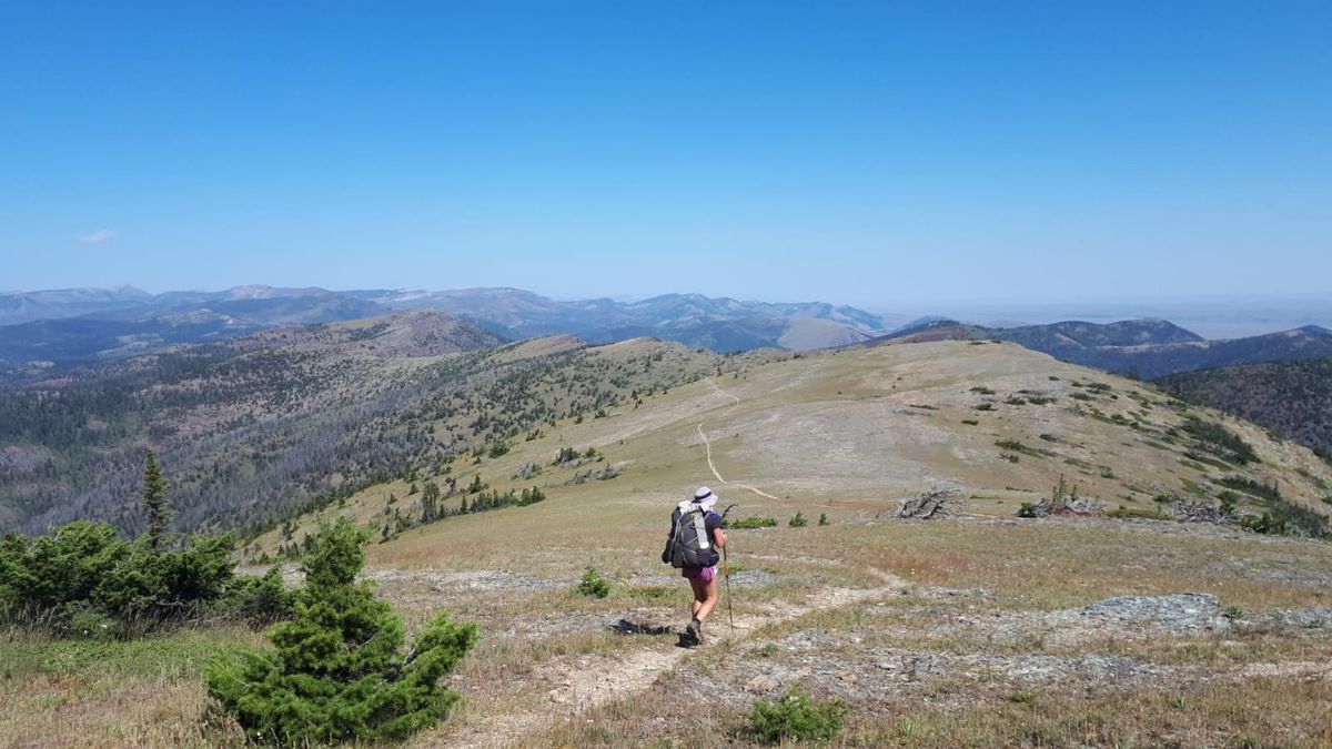 Unser Trail geht genauso schön weiter, wie er gestern angefangen hat. Immer weiter bergauf, dann bleiben wir viele Stunden auf der Höhe und laufen auf dem Bergkamm. Rechts von uns liegt der Granite Butte Mountain. Hier haben wir die Wahl zwischen einer oberen und einer unteren Route. Ausnahmsweise nehmen wir den unteren Weg, der westlich vom Berg um den Hang herumführt. Dort können wir auf etwas Schatten von Bäumen hoffen, oben auf dem Grat würden wir in der Sonne braten. Es knackt über uns im Gebüsch. Gerade eben noch kann man einen ausgewachsenen Elch mit gewaltiger Schaufel sehen. Der bleibt allerdings nicht stehen, um sich fotografieren zu lassen. Außerhalb der Nationalparks sind die Wildtiere sehr scheu. Wer stehenbleibt, der läuft Gefahr, abgeknallt zu werden.