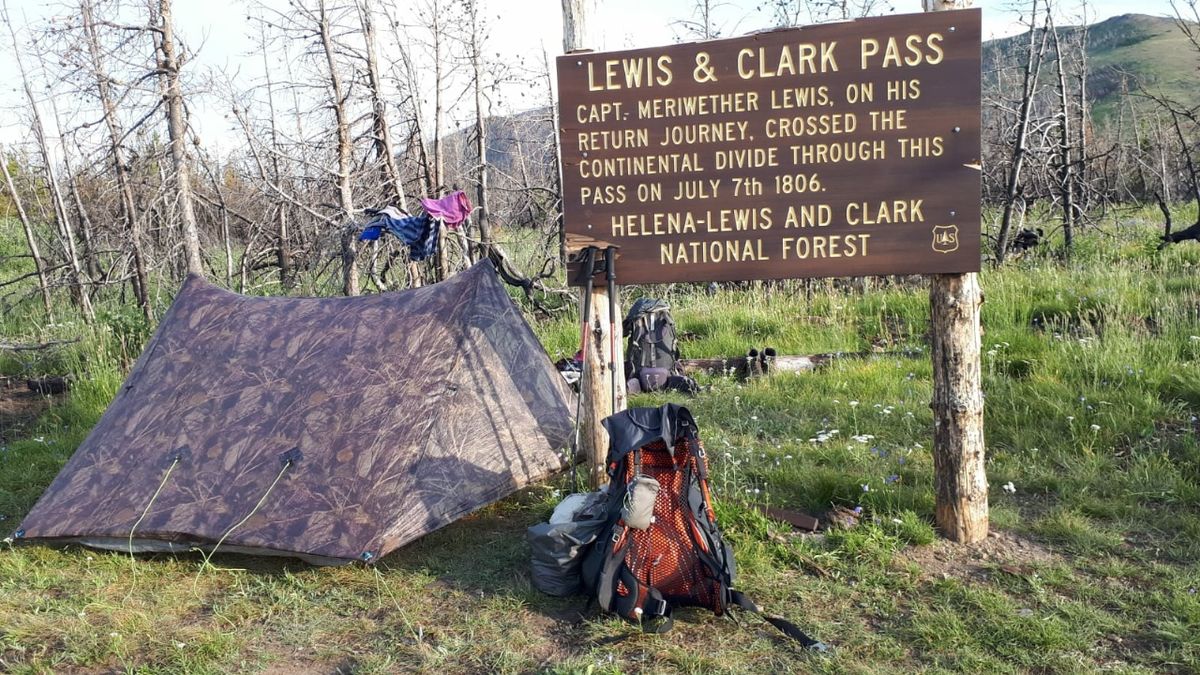 Es muss sehr viel geregnet haben, aber innen sind wir komplett trocken geblieben. Sehr gut. 🙂 Bereits vor 8.00 Uhr früh sind wir zweimal mit voller Montur durch den Fluss gelaufen. Der Dearlodge River ist nur knietief. Nach 5 Tagen werden so die Füße endlich einmal wieder sauber. Natürlich haben wir bei der Wasserknappheit in den letzten Tagen nichts zum Füße-Waschen verschwendet. Es gibt viele Abbieger ohne Zeichen, an denen man sich verlaufen könnte. Auf den Holzschildern stehen die Namen der Trails in alle Richtungen, nur der Continental Divide wird nicht erwähnt. Wie gut, dass es Wanderer gibt, die vor uns dasselbe Problem hatten und mitgedacht haben. Mit schwarzem Edding ist das CDT-Symbol aufgemalt, ein Pfeil zeigt, wo es weitergeht. So einfach wird vielen Hikern geholfen. Das Hühnerauge von Thomas macht wieder Probleme. Blödes Ding. Es muss in der ersten Pause mit Moleskin abgepolstert werden, danach geht es ohne Schmerzen weiter. Jetzt gibt es schon Nudeln zum Frühstück. Beide Tüten Haferflocken sind leer bis auf einen kleinen Rest. Auch die Zwischendurch-Snacks werden langsam knapp. Wir hoffen, dass wir es morgen bis Augusta schaffen werden.