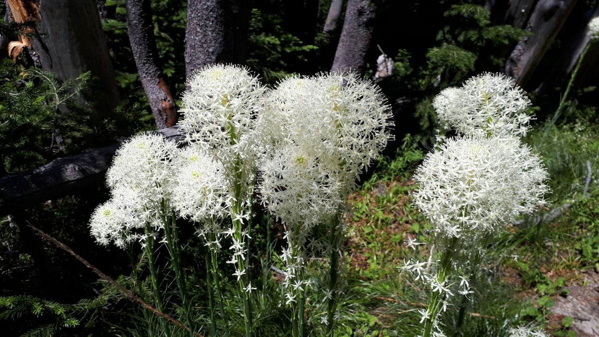 Sehr interessant sind mannshohe weiße Blüten, die in Gruppen zusammen am Wegesrand stehen. Naja, vielleicht nicht ganz mannshoch, aber ein 1,50 Meter kleiner Mensch würde dazwischen verschwinden. Bärengras nennt sich diese Pflanze, die tatsächlich bis zu 1,80 hoch wachsen kann.