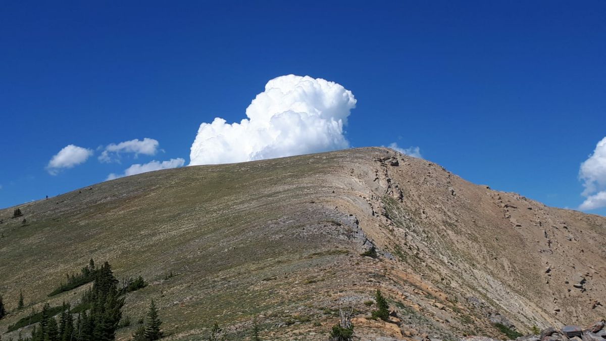 Um 15.00 Uhr beginnt es in der Ferne zu donnern. Dazu kommt ein heftiger Wind auf, der uns oben auf dem Grat angenehme Abkühlung bringt. Ein weiterer positiver Nebeneffekt ist, dass er die dunklen Wolken wegfegt. Das Gewitter zieht weiter, wir bleiben erstmal verschont.