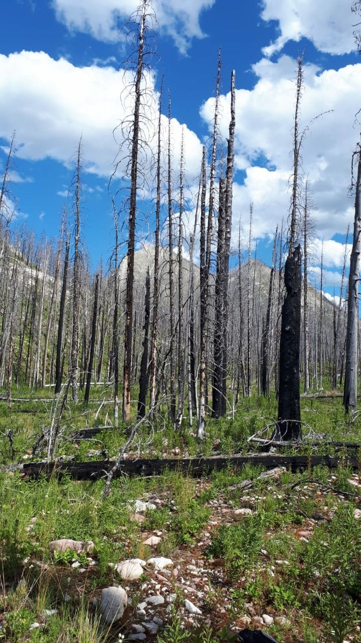 Wir haben unser Nachtlager an einer Stelle eingerichtet, die ringsum von verkohlten Bäumen gesäumt ist. Hier muss es vor langer Zeit ordentlich gebrannt haben. Vielleicht sogar im Jahr 2017, als wir auf dem CDT unterwegs waren ? Auf jeden Fall scheint es ein riesiges Feuer gewesen zu sein, so großflächig wie alles verkohlt ist. Stundenlang laufen wir durch dieses von Feuer vernichtete Gebiet, wo sich allerdings bereits die jungen Bäumchen durchsetzen.