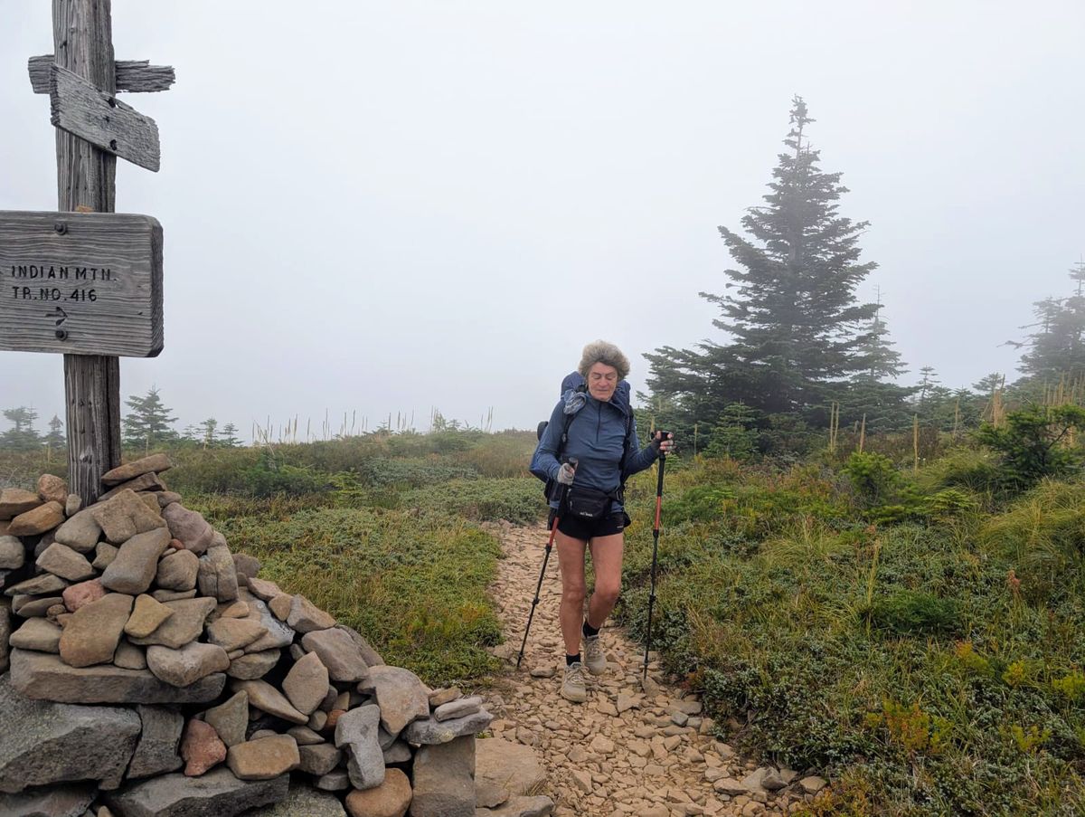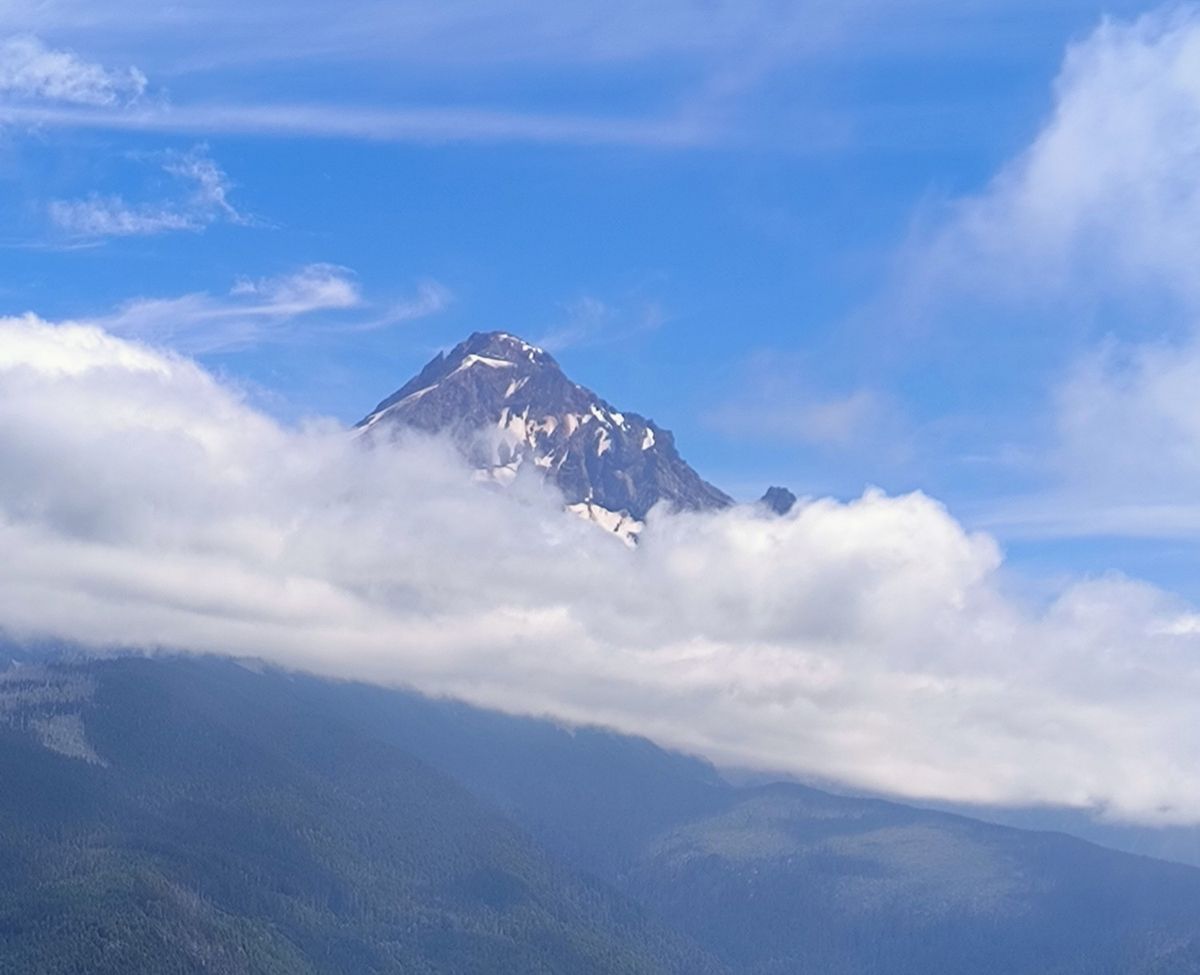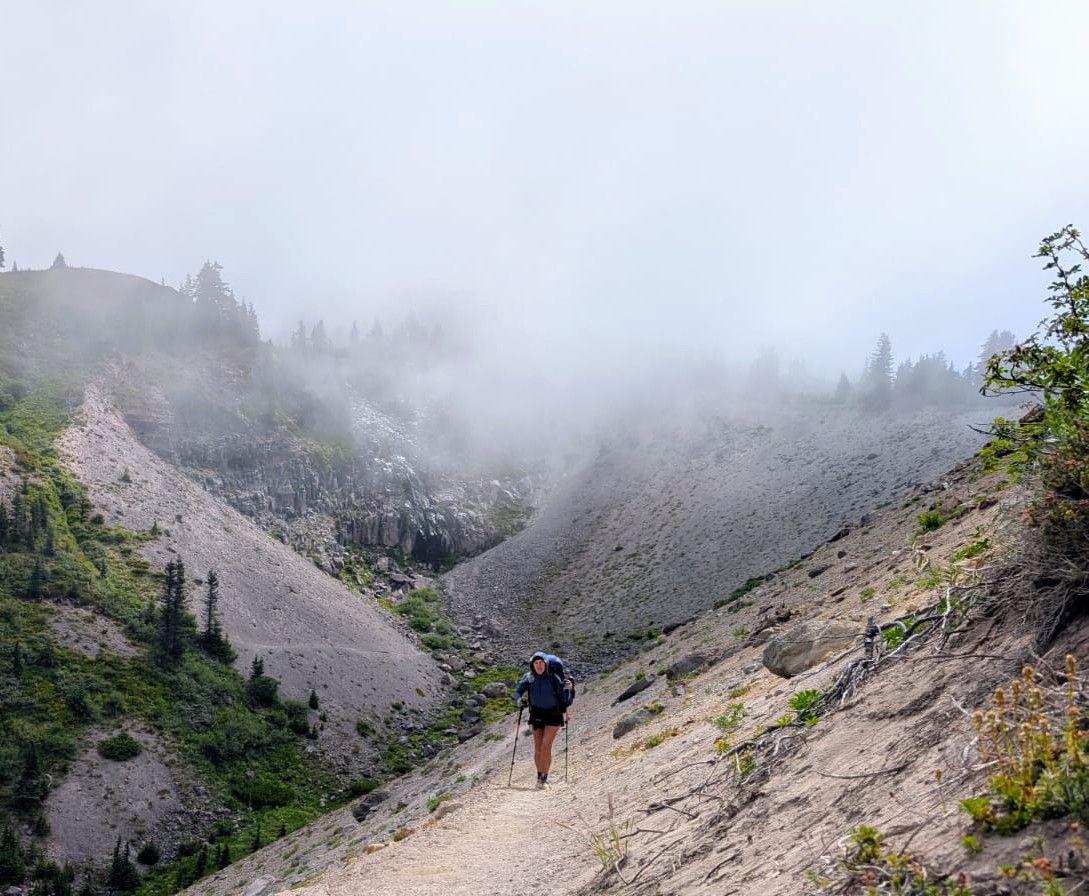 Wir starten mit leichtem Aufstieg und Traverse durch Geröllfelder. Die Picas sind heute ungewöhnlich aktiv und flitzen zwischen den Felsen herum. Entweder mögen die es lieber kalt, oder sie sind morgens um 8.00 Uhr so emsig bei der Frühstücks-Beschaffung. Danach wird der Pfad schmal und ist zugewachsen mit Büschen. Die Nebelwolken hängen tief. Dicke Tropfen fallen aus den Wolken. Ist das nun Regen ? Auf jeden Fall werden wir nass durch das dichte Grünzeug an unseren Beinen. Höher geht immer – wir steigen weiter auf. Der PCT bleibt lange oben, wir laufen immer schön auf der Ridgeline. Leider keine Aussicht, wir tappen im Nebel. Irgendwann lichtet sich der Vorhang kurz, und vor uns taucht der weiße Gipfel des Mount Hood auf. Mit 3425 Metern ist er der höchste Berg in Oregon und der vierthöchste der Kaskadenkette. Einen Moment später ist Mount Hood wieder in den Wolken verschwunden.