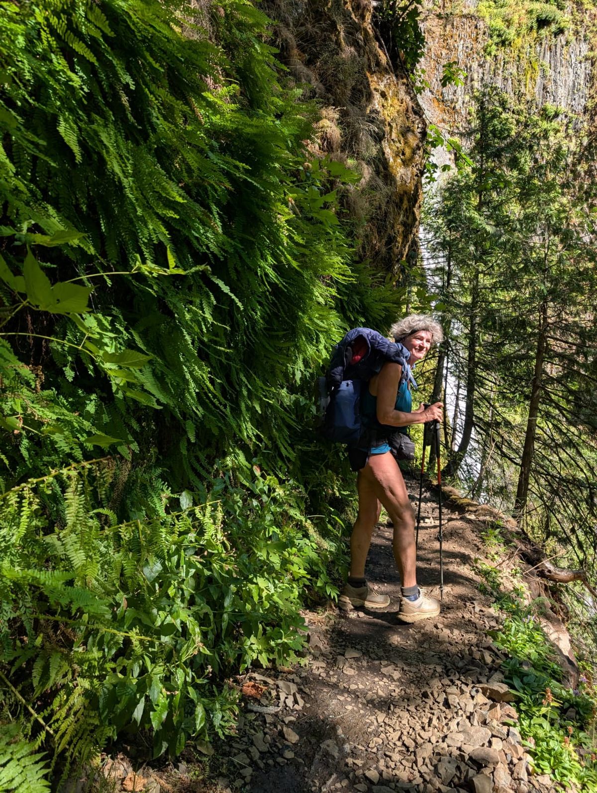 Wir haben uns für die alternative Route Eagle Creek Trail entschieden. Beinahe die Hälfte aller Hiker laufen diese 25 Kilometer lange Variante, weil sie besonders viel Natur zu bieten hat. Wunderbare Szenerie. Der Weg führt bergauf immer parallel zum Eagle Creek. Rechts von uns liegt eine tiefe Schlucht, unten fließt der Fluss. Alles ohne Netz und doppelten Boden. Man soll die Route nicht gehen, wenn man nicht schwindelfrei ist. Kein Problem, wir lieben diese ausgesetzten Wege. Es geht auf schmalem Grat immer hart an der Kante entlang. Überholen ist an manchen Stellen schwierig, weil kaum Platz zum Ausweichen ist. Ein Dutzend Brücken und noch mehr Wasserfälle machen den Eagle Creek Trail schön abwechslungsreich.