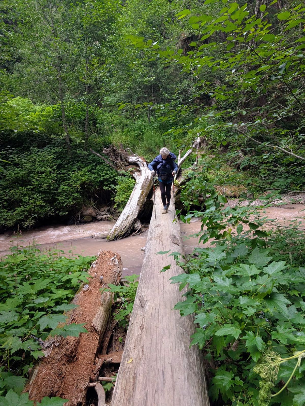 Lautes Rauschen kündigt einen Fluss an. Wir sind im Abflussbereich der Gletscher vom Mount Jefferson. Der Strom hat richtig Kraft, obwohl er nur etwa 2 Meter breit ist. Vertrauenerweckend sieht die Brücke über den Whitewater Creek nicht aus. Eine Bohle fehlt, ein paar Löcher im Holz, aber sie hält. Wenig später nähert sich der Weg dem Russell Creek, der sich eine tiefe Rinne in die Schlucht gewaschen hat. Ebenfalls ein lebhafter Gletscherstrom mit milchig grauem Wasser, breiter als der vorige. Es ist 18.00 Uhr, um diese Zeit brodelt der Fluss vom vielen Schmelzwasser. Unser Pfad ist plötzlich zu Ende. Auf der anderen Seite geht es weiter. Keine Brücke. Über’s Wasser führen entweder dünne Baumstämme, die ständig überspült werden oder glitschige Steine in zu großem Abstand. Beides ist uns zu unsicher. Wir möchten weiter flussaufwärts nach einer besseren Stelle suchen, aber direkt am Ufer ist alles total zugewachsen. Deswegen gehen wir nochmal ein Stück zurück. Zwei Serpentinen höher finden wir einen Zugang zum Fluss und eine schmalere Stelle mit trockenem Baum zum Balancieren.