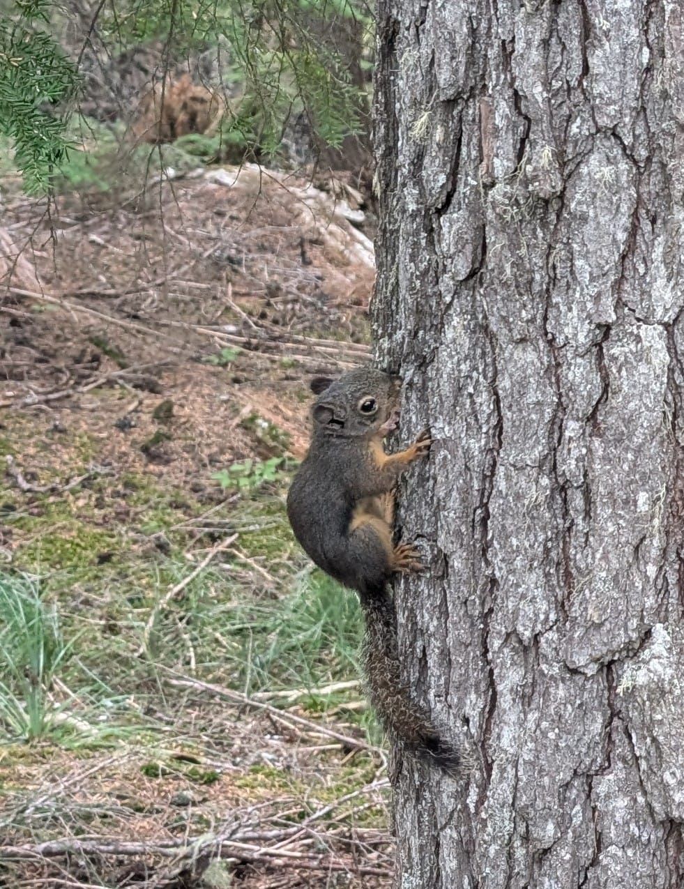 Zunächst führt der PCT hinunter zum Warm Springs River, den wir auf einer Baumstamm-Brücke überqueren. Danach geht es lange Zeit bergauf. Frisch und ausgeruht bei kühlen Temperaturen laufen wir das einfach nur weg. Die von oben Entgegenkommer sind nass, bei uns nieselt es nur minimal. Wir haben viel Spaß mit einem wilden Eichhörnchen. Es flüchtet nicht vor uns, sondern gebärdet sich wie verrückt. Immer wieder lugt es mal links und mal rechts hinter dem Baumstamm hervor. Das Eichhörnchen scheint mit uns zu „sprechen“. Wahrscheinlich schimpft es.