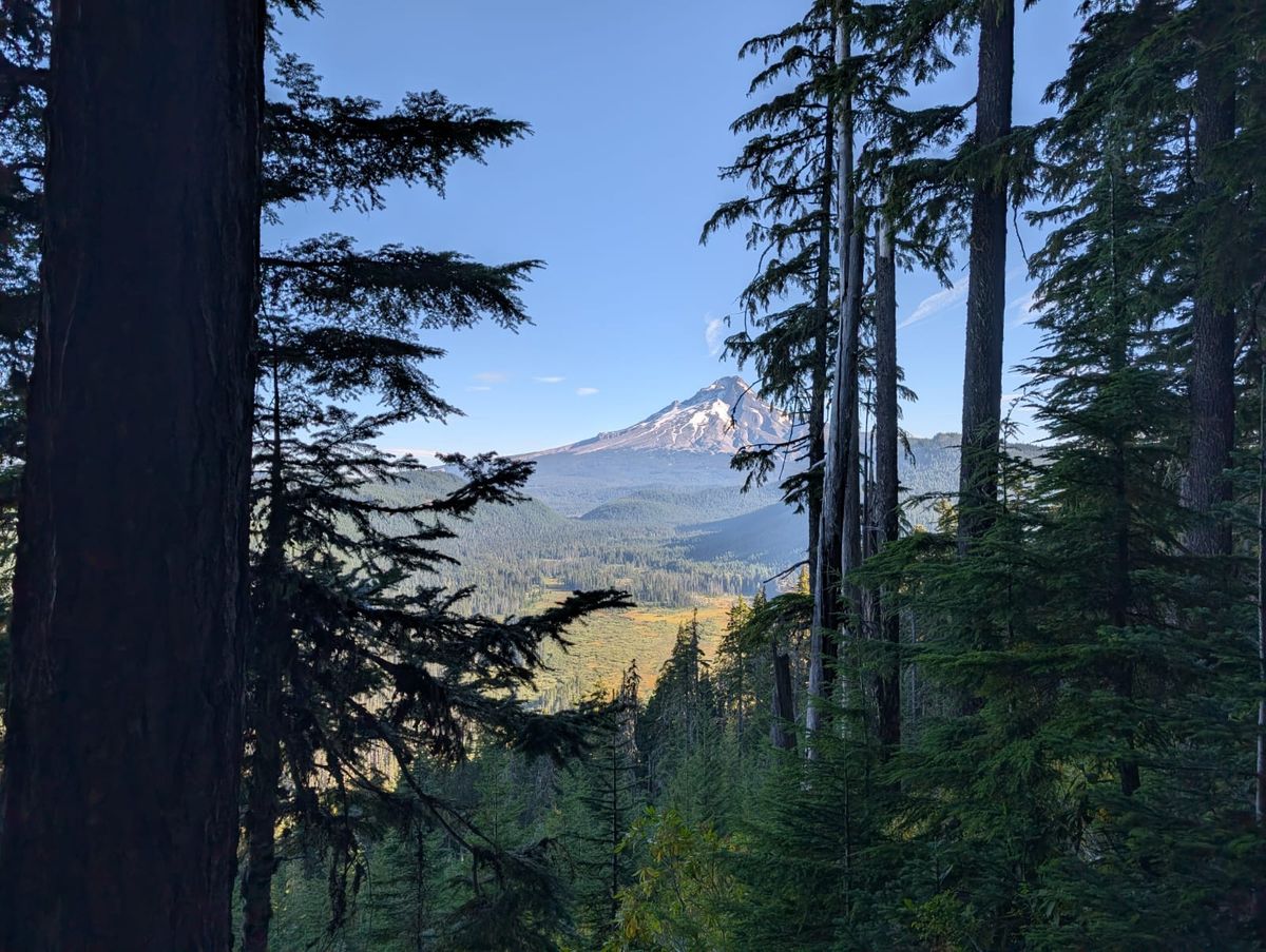 Die kühlere Luft verleiht Thomas anscheinend Flügel. Mit den schnellen Schuhen und ohne Sonne läuft er mir heute davon. Es gibt wieder reichlich Heidelbeeren und Himbeeren zum Naschen. Links und rechts des Weges wächst jetzt Rhododendron statt des stacheligen Krautes. Gut. Wir laufen durch die Mount Hood Wilderness. Zum Nachmittag geht es richtig bergab. 700 Höhenmeter in die Tiefe – und das auf einer Strecke von nur 3 Kilometern. Einfach und schnell. Aber wir können uns nicht uneingeschränkt darüber freuen, wohl wissend, dass wir uns jeden Meter wieder erkämpfen müssen, wenn der Weg anschließend wieder nach oben führt.