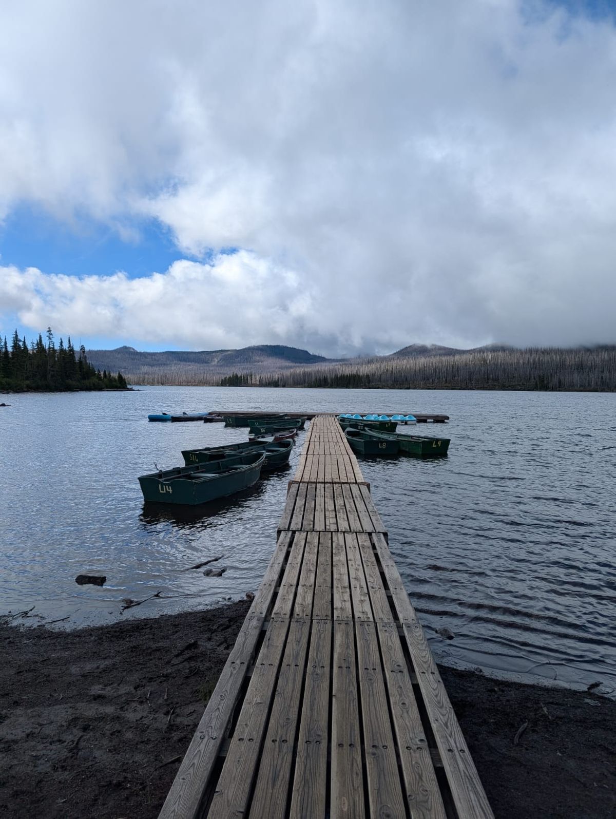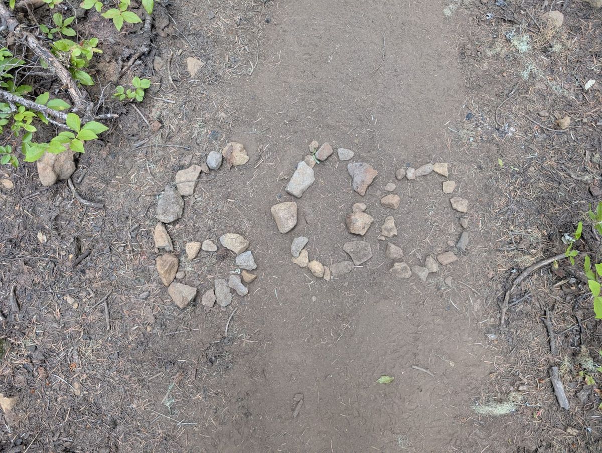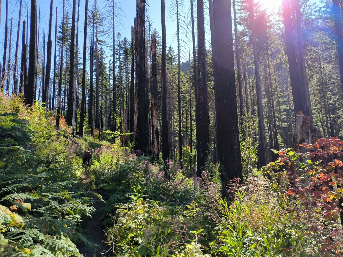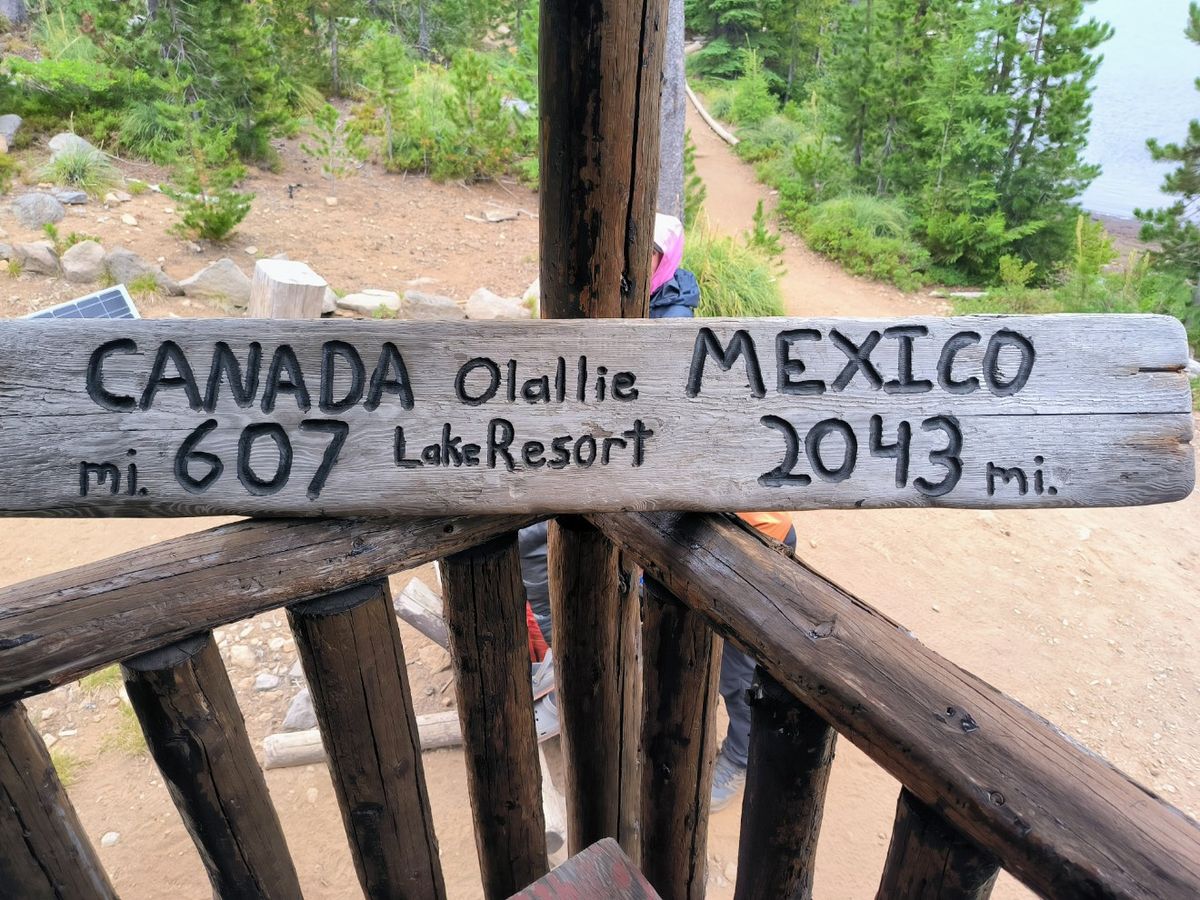 In der letzten Stunde laufen wir durch Waldbrand-Gebiet. Das Feuer kann noch gar nicht so lange her sein, es ist noch nicht viel Grün nachgewachsen. Später erfahren wir, dass diese Gegend im Sommer 2021 vom Lionshead Fire stark verwüstet wurde. Ein böiger Wind lässt die toten Bäume quietschen und knarren. Es fängt an zu nieseln. Ich bin hin- und hergerissen zwischen Regenkleidung an oder aus. Wir diskutieren darüber, ob das nun „Regen“ ist. Thomas gewinnt. Er überzeugt mich mit dem Argument : „Deine Klamotten und dein Rucksack werden viel nasser vom Schwitzen.“ An einem Baum hängt ein Willkommens-Schild mit Wegbeschreibung vom Olallie Resort. Klingt nett. Hiker-freundlich. 🙂