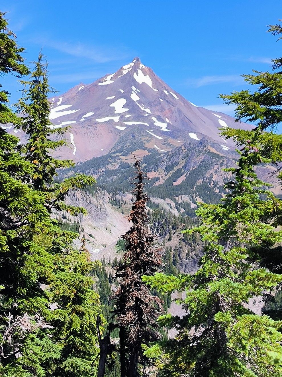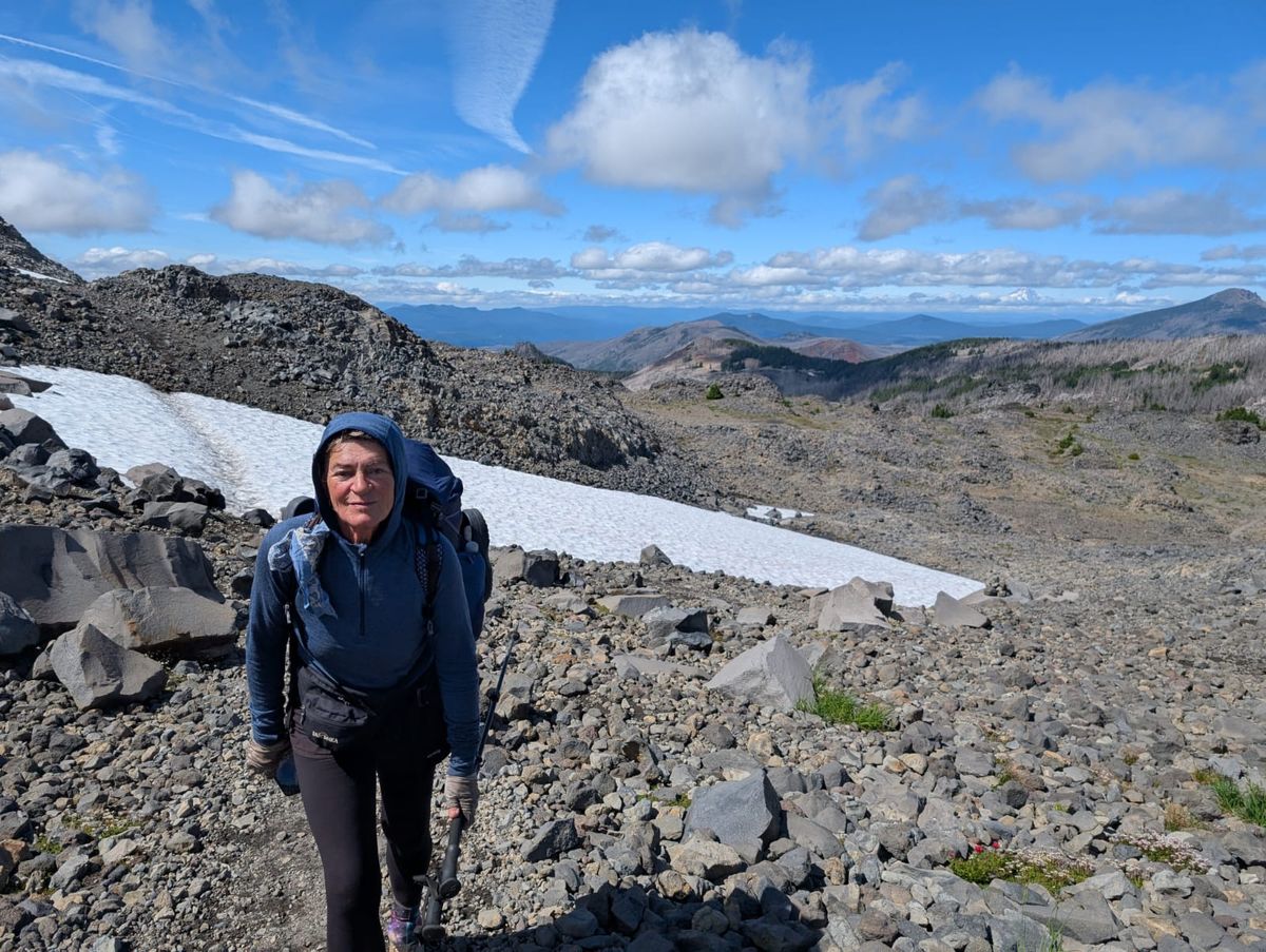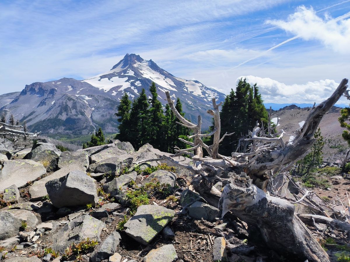 Alpine Landschaft, wie wir es lieben. Irgendwann gibt es nur noch Geröll, ab und zu mal ein Steinmännchen. Auf 2300 Meter Höhe wächst gar nichts mehr. Wir befinden uns jetzt im Jefferson Park. Zelten auf den nächsten Meilen verboten, aber es ist erst Nachmittag. Mount Jefferson liegt direkt vor uns. Mit 3199 Meter ist er der zweithöchste Berg im US-Bundesstaat Oregon. Im Winter mit Schnee schafft er es vielleicht sogar auf 3200 Meter. 😉